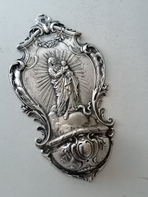 Bénitier en argent massif, orfèvre Hénin & Cie Paris fin XIXe début XXème, travail fin. Vierge Marie et l'enfant marchant sur le serpent