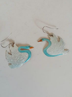 Paire de boucle d'oreille en argent peinte émaillée, décor cygne.