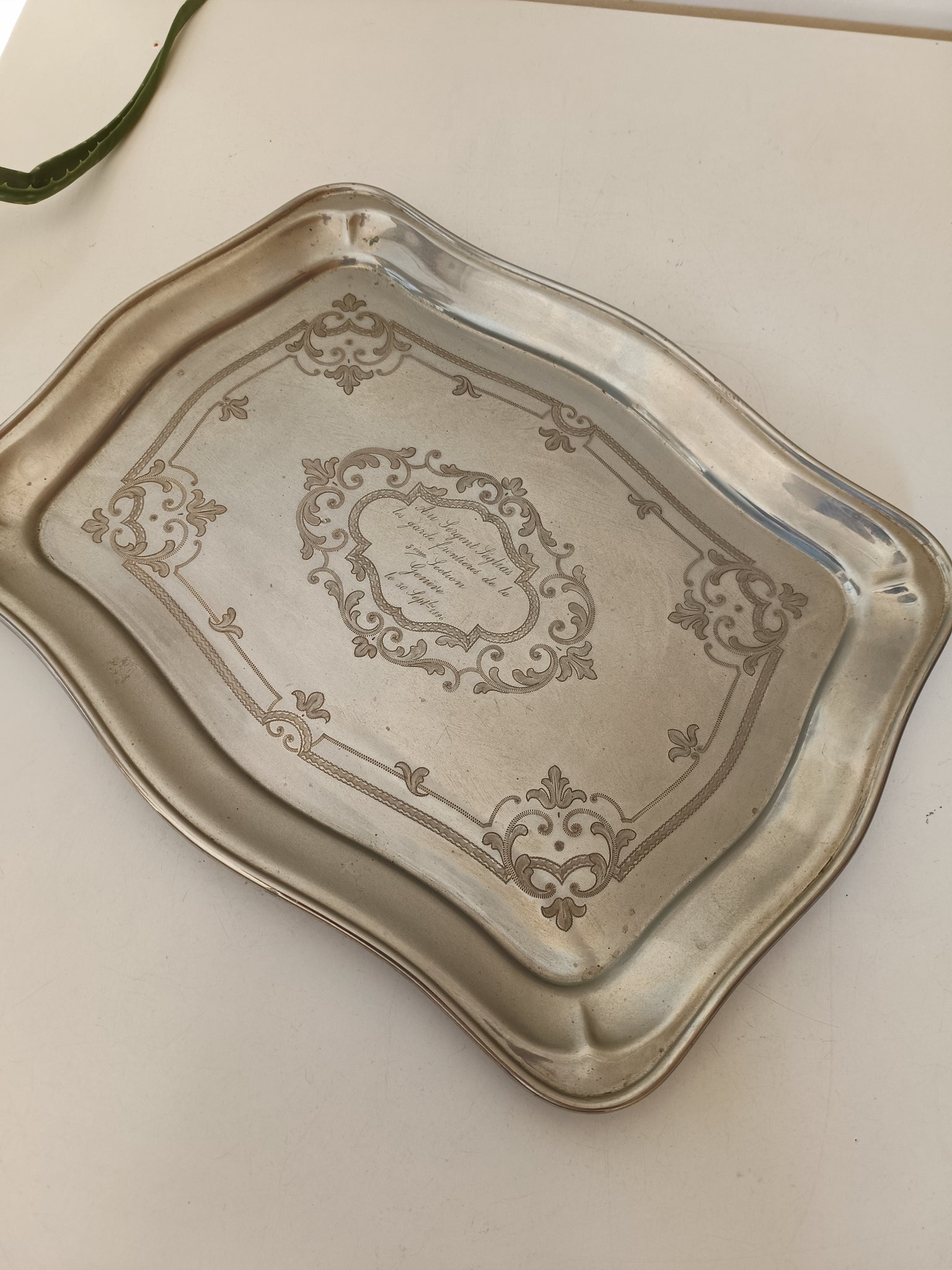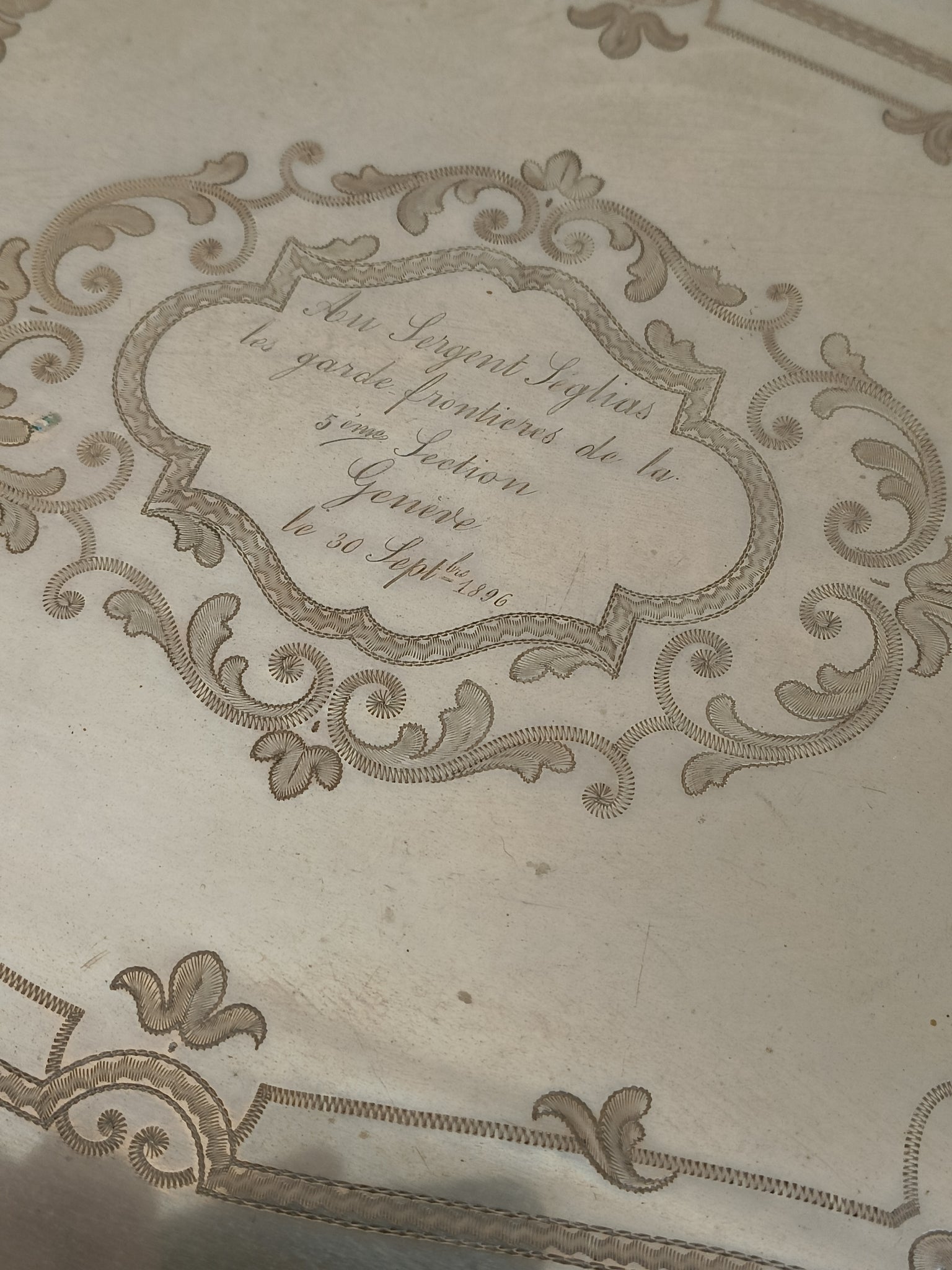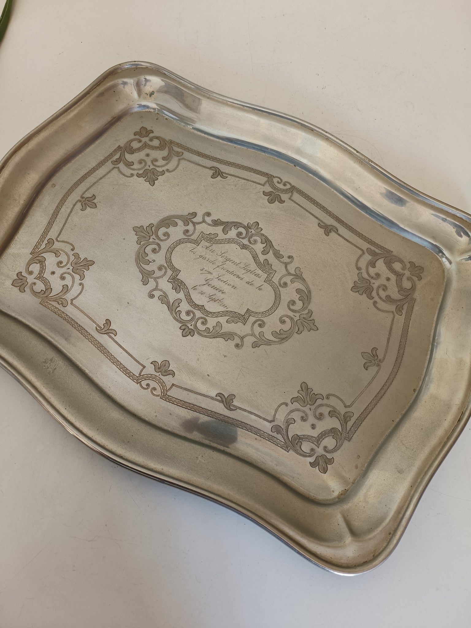 Plateau en Maillechort guilloché main ,fin XIXÈME offert au garde frontière de Genève.