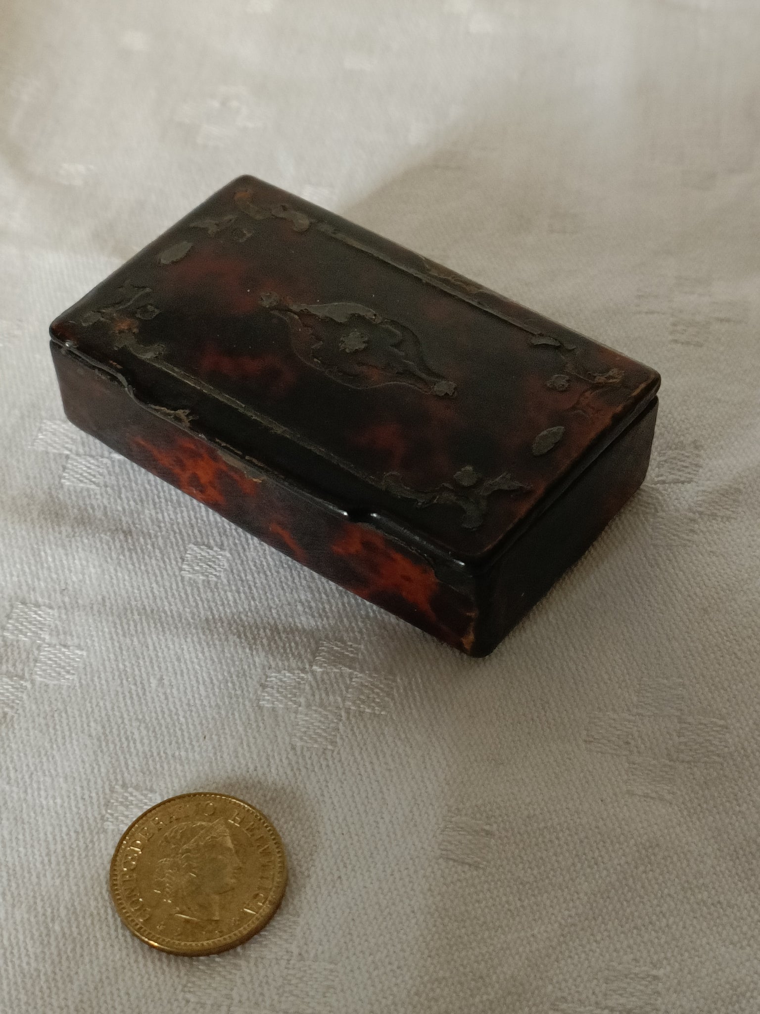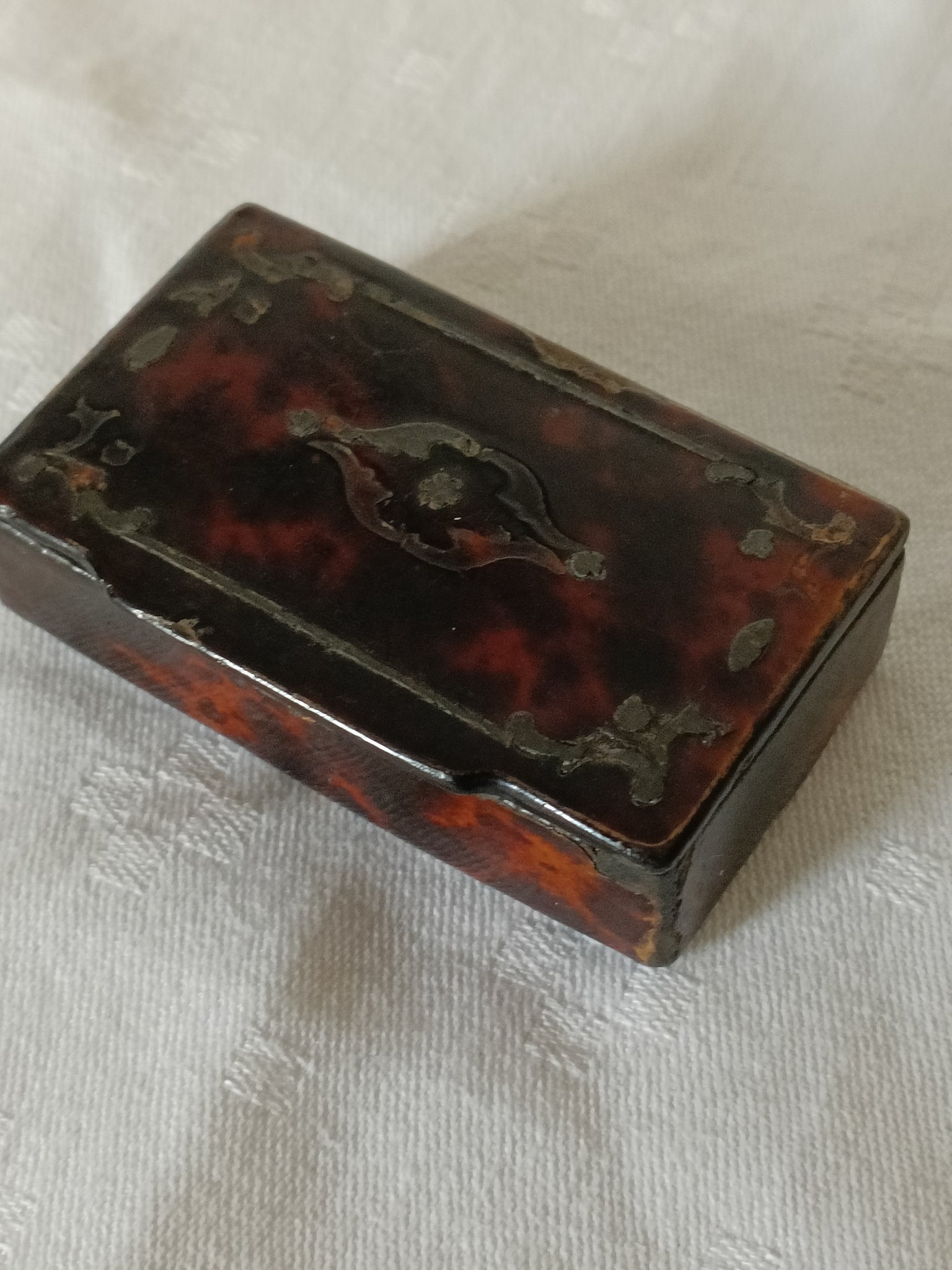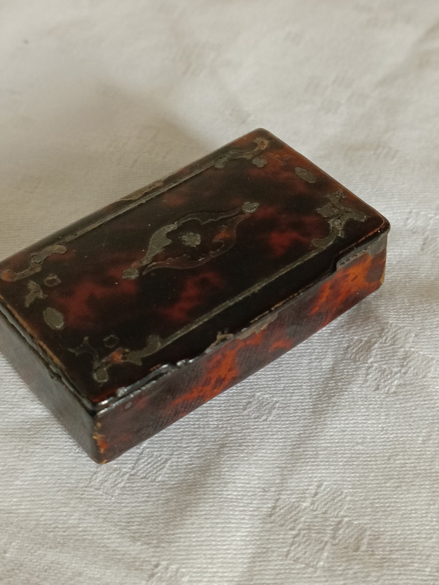 Petite boîte à tabac à priser boule , d'époque XVIIIE Louis XIV /Louis XV en marqueterie écaille et incrustation étain. Dans son jus avec son contenu !