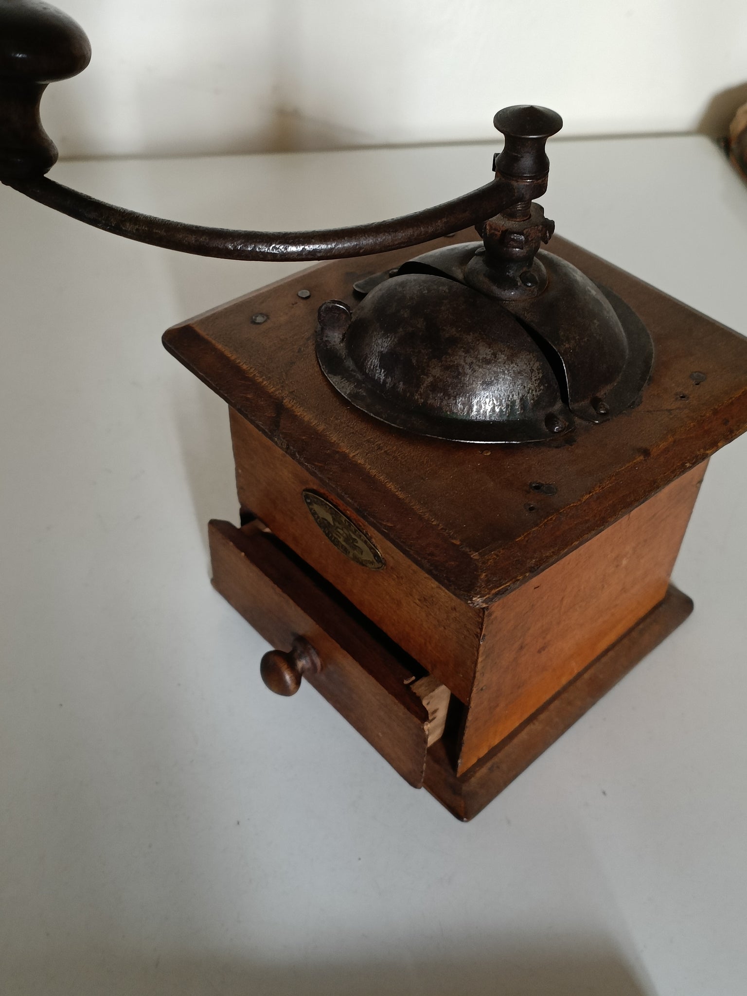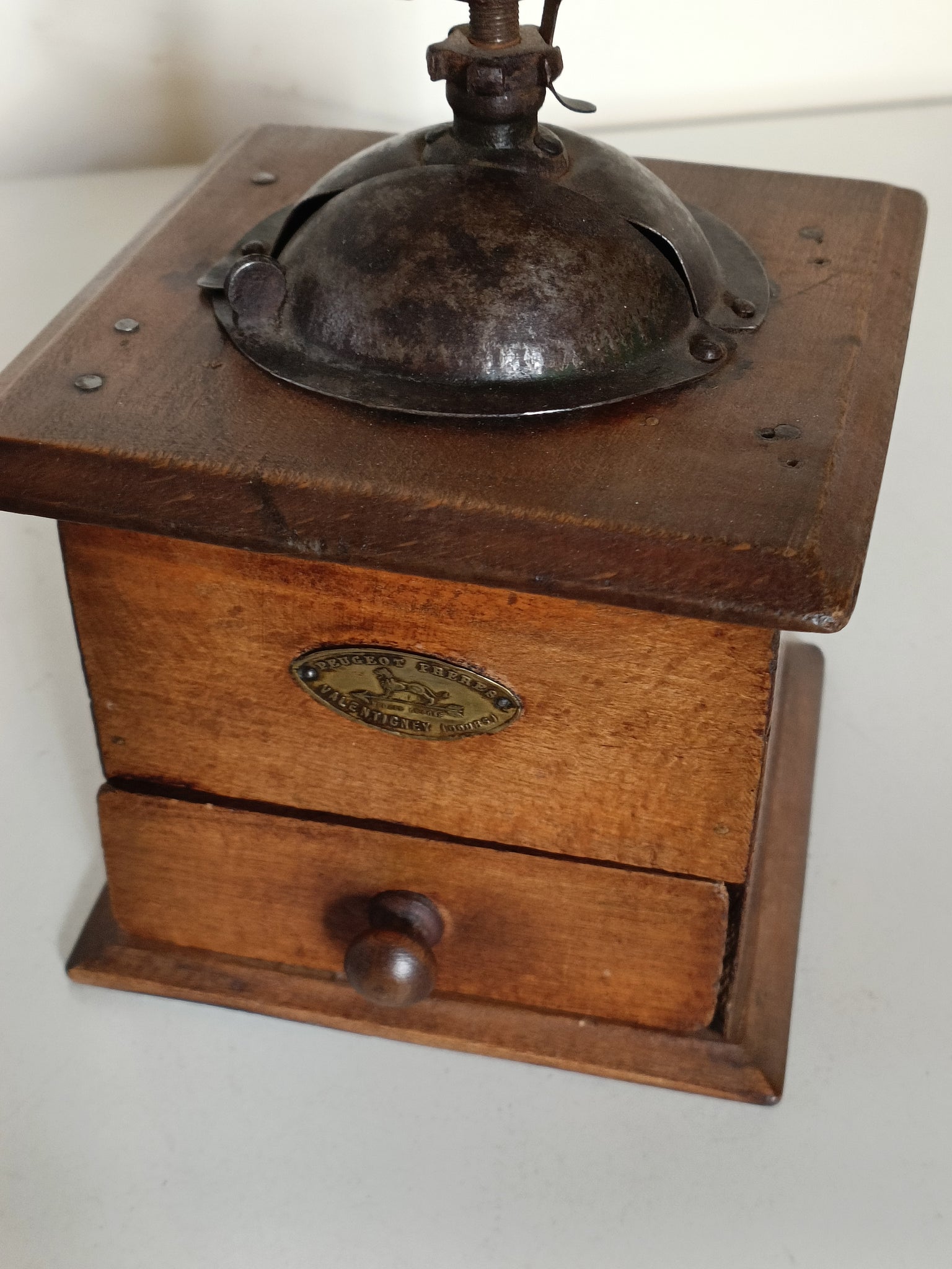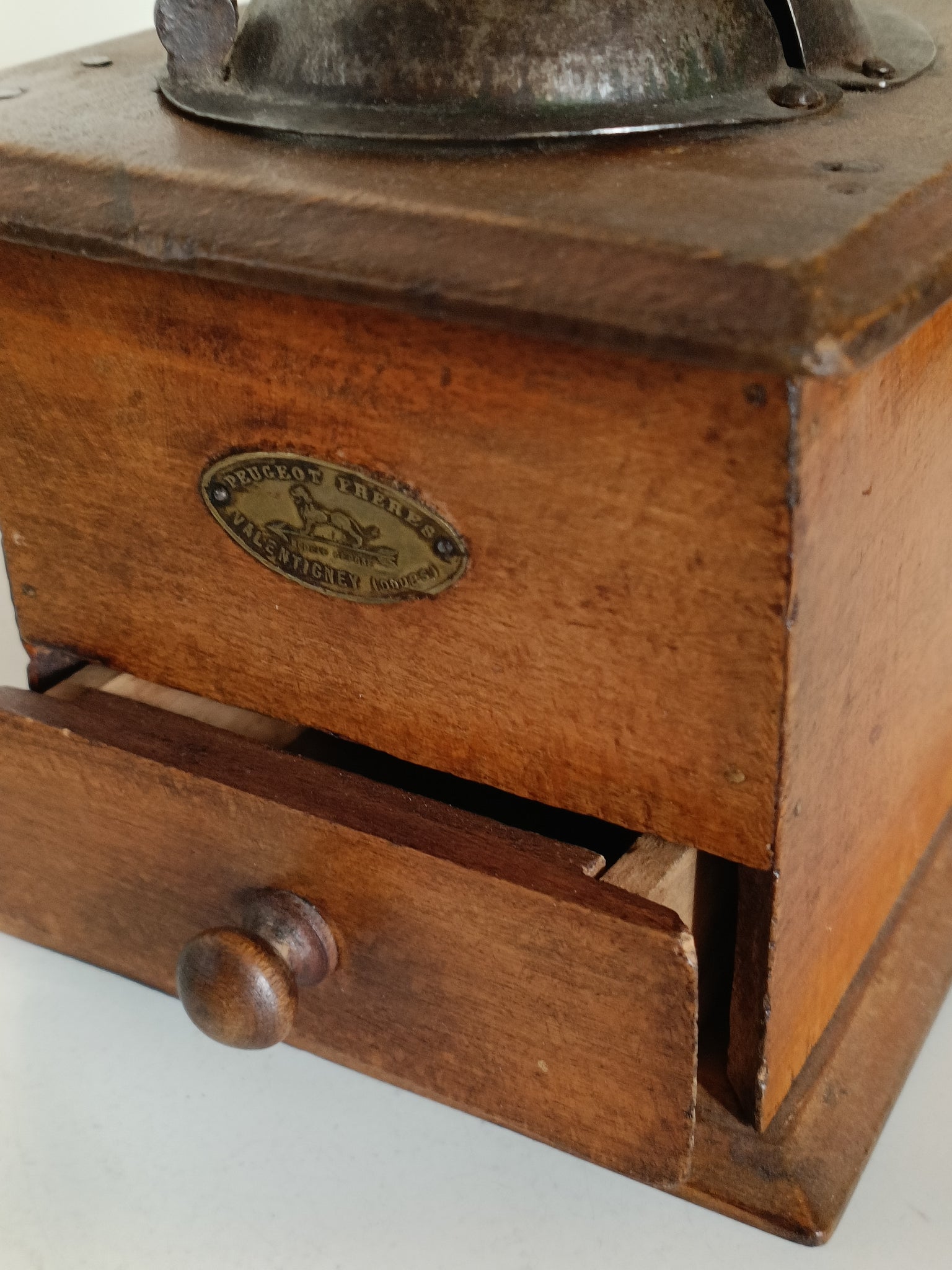 Peugeot France moulin à café ou autre grain , en bois de hêtre, fin XIXÈME début Xxème. Fonctionne ! Et avec son étiquette !
