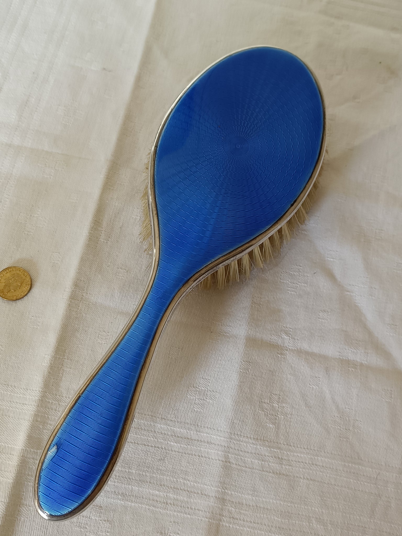 Ravissante brosse à cheveux en argent massif Sterling Anglais , émail bleu guillochée. Avec un petit éclat. Début XXÈME