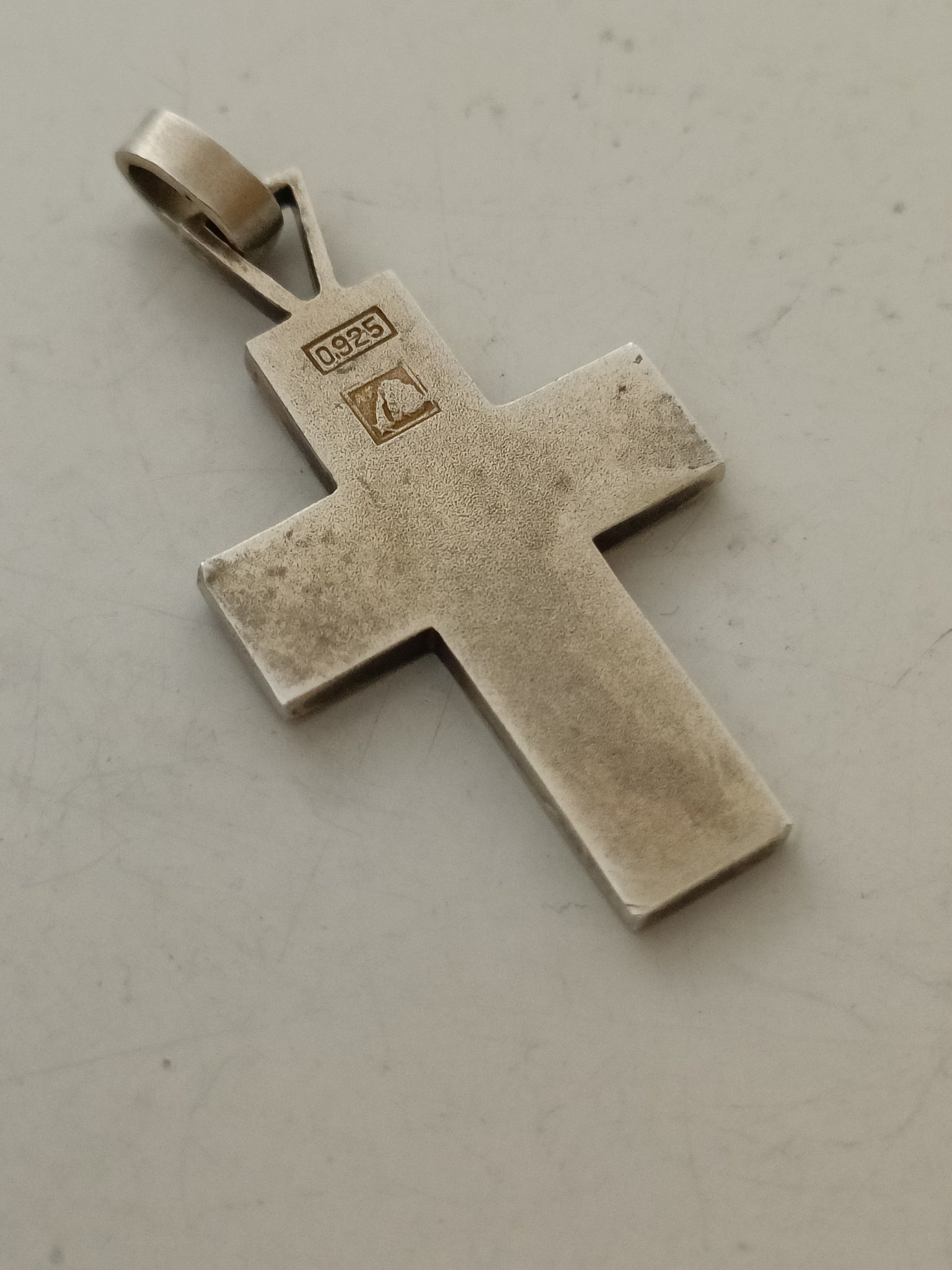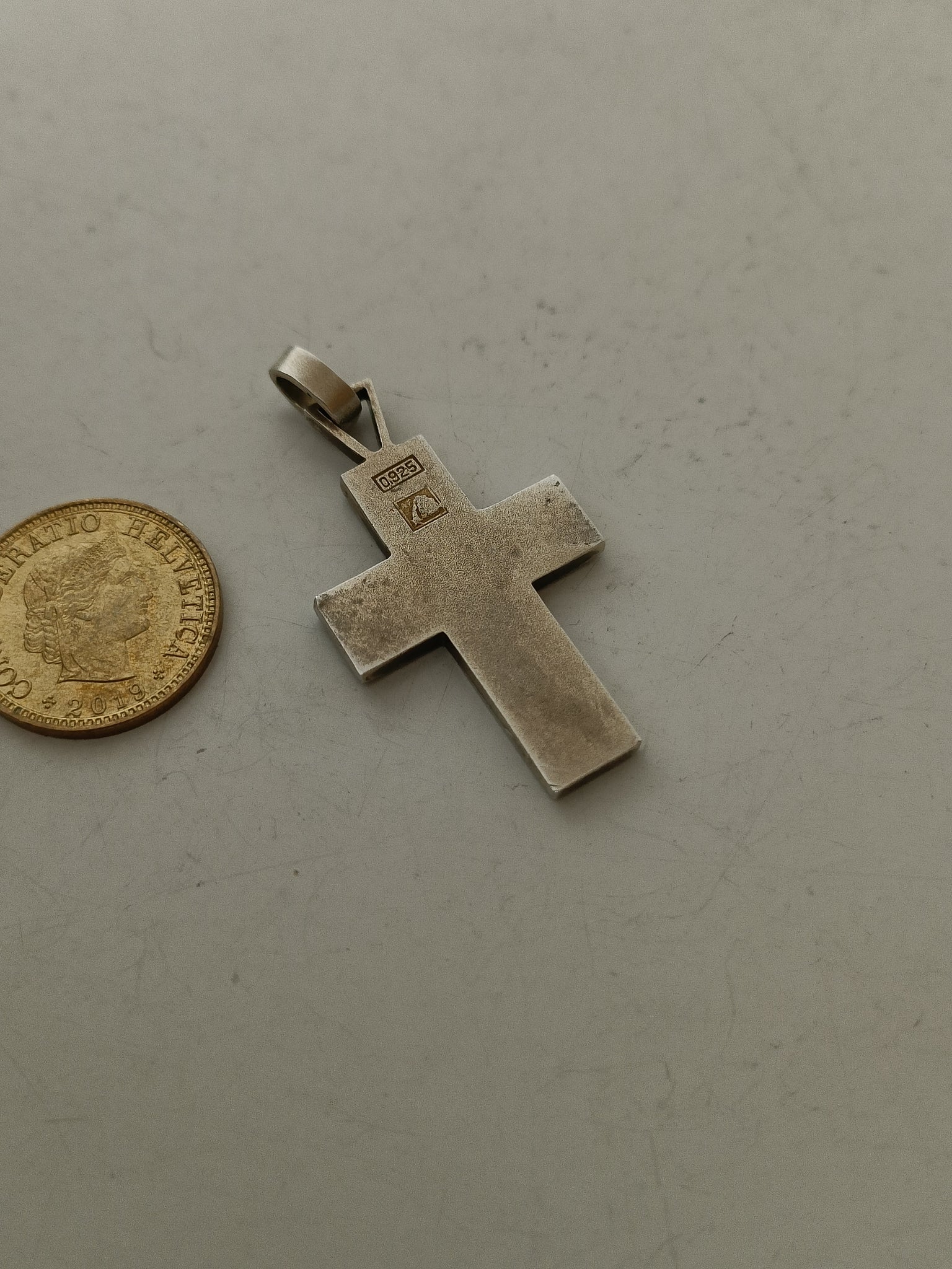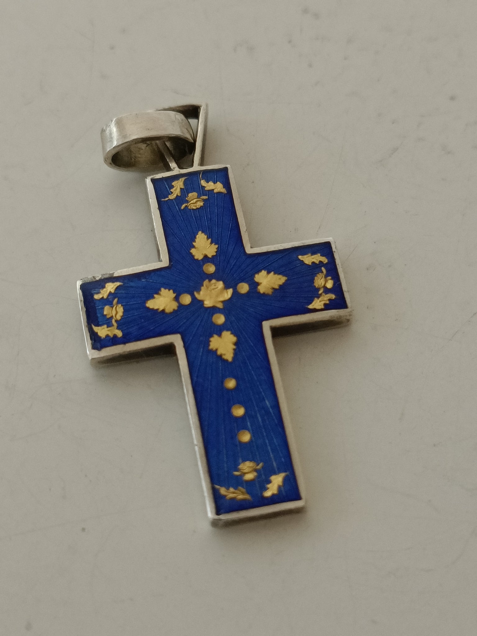 Croix en argent et émail bleu , décors peints à l'or fin. Parfait état.