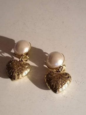 Paire de boucle d'oreille clip vintage doré, forme de cœur.