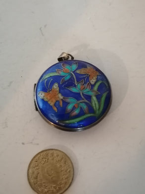 Pendentif photo souvenir en argent émaillé, décors papillons.