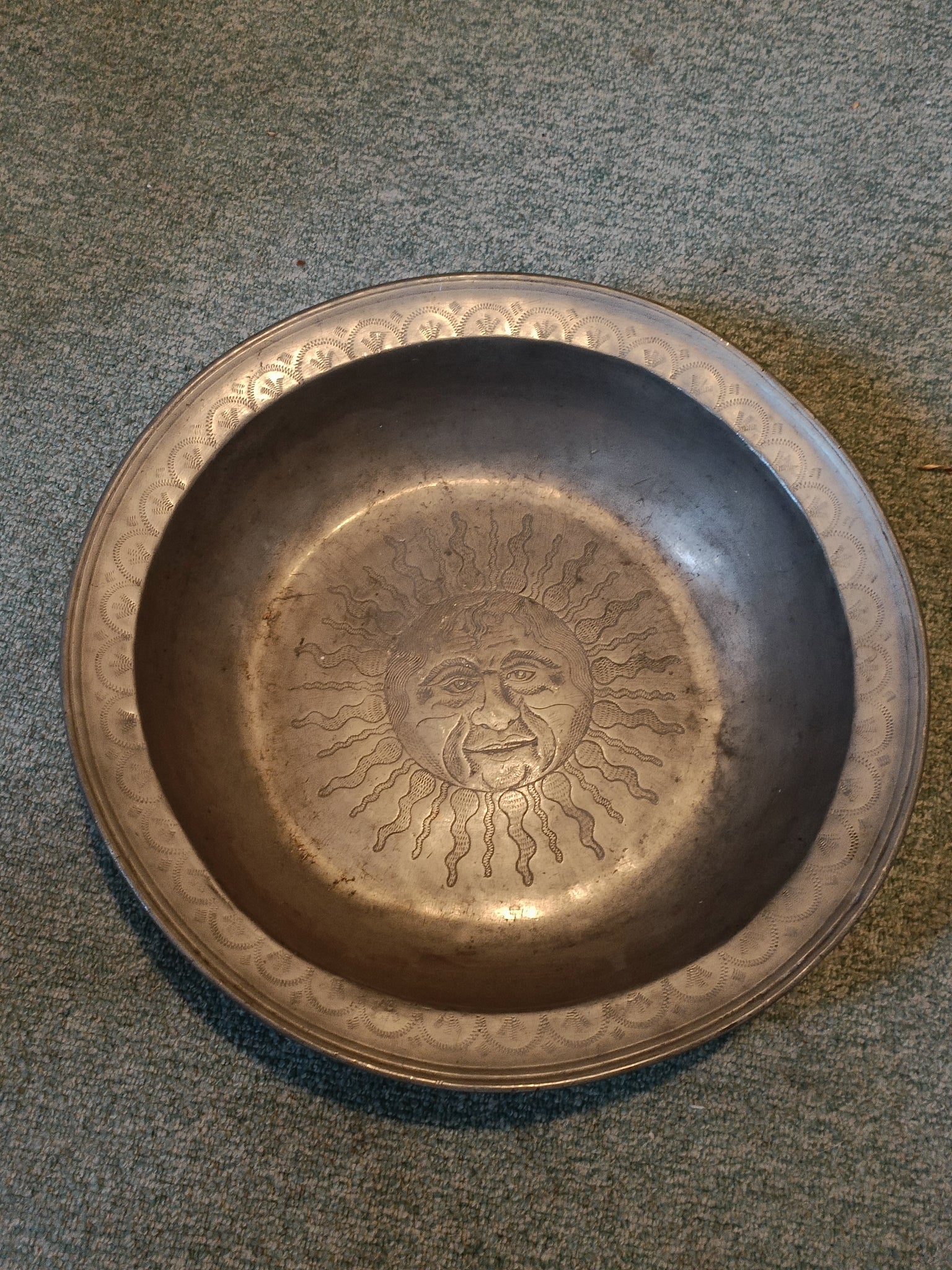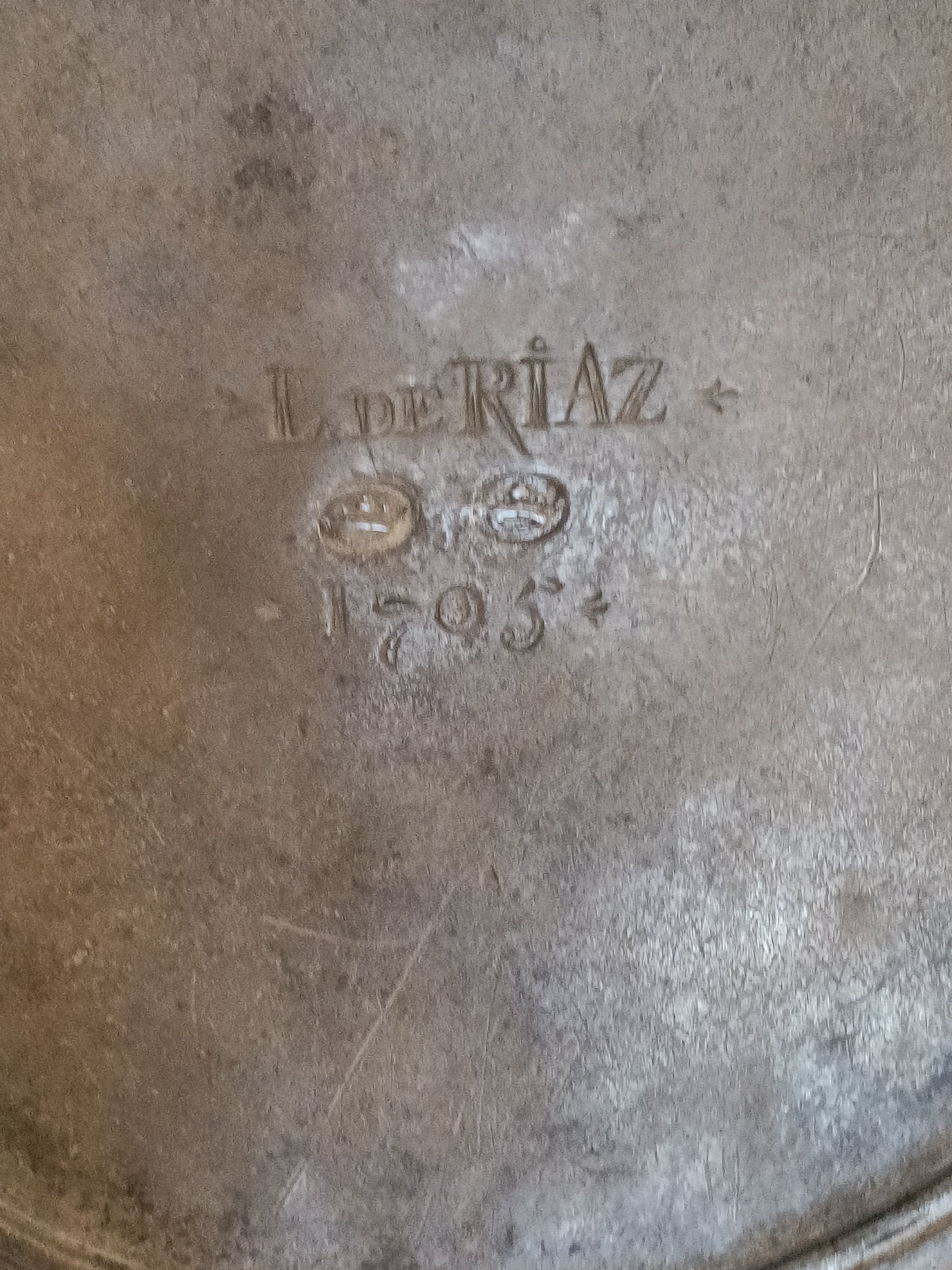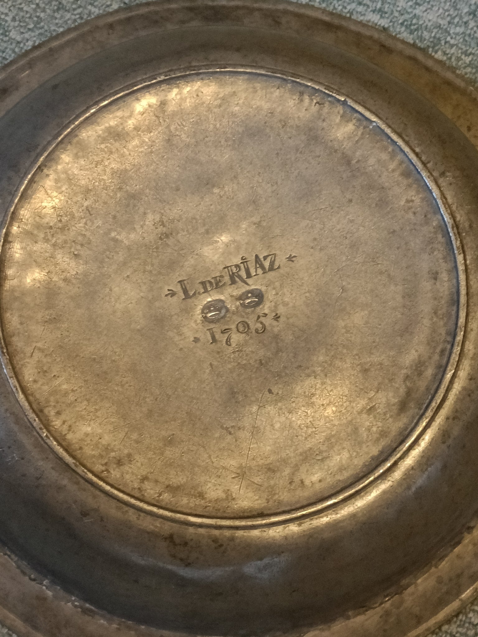 Exceptionnelle et rare grand plat creux fin XVIIE début XVIIIE en étain . Poinçon probablement Bâle à identifier. Appartenu à de Riaz probablement un notable Fribourgeois ou ecclésiastique. Pourrai servir pour faire les baptêmes. Pièce de musée .