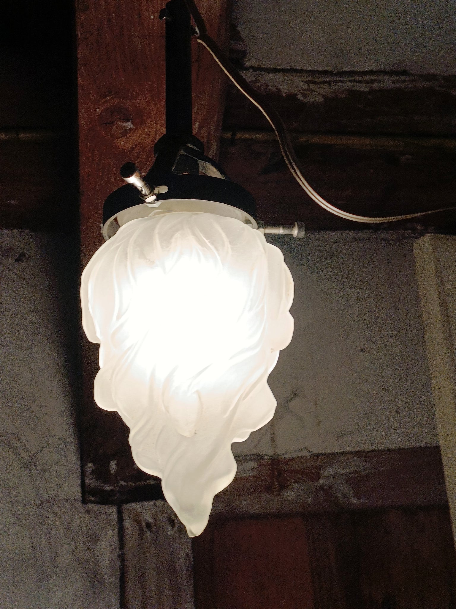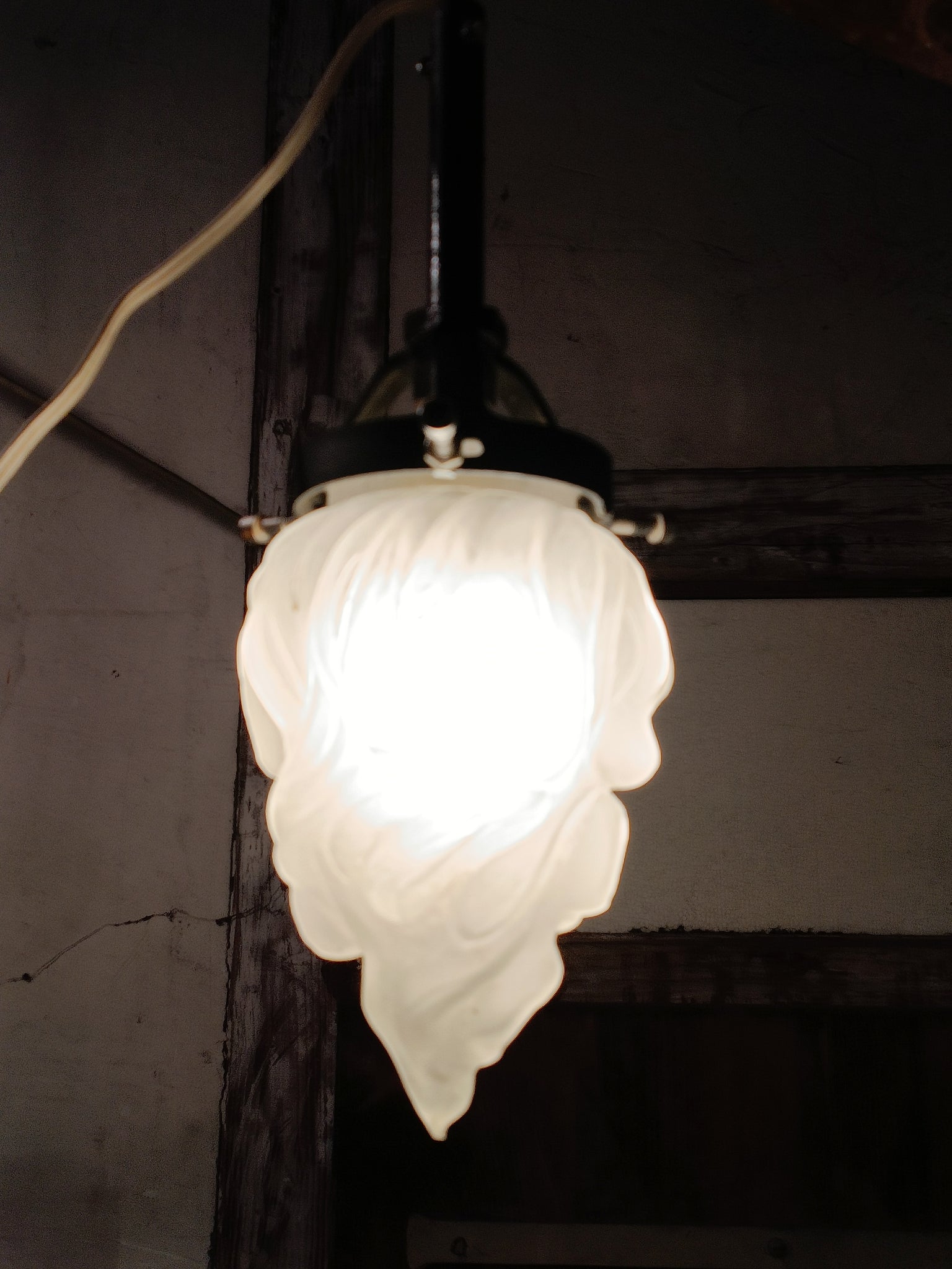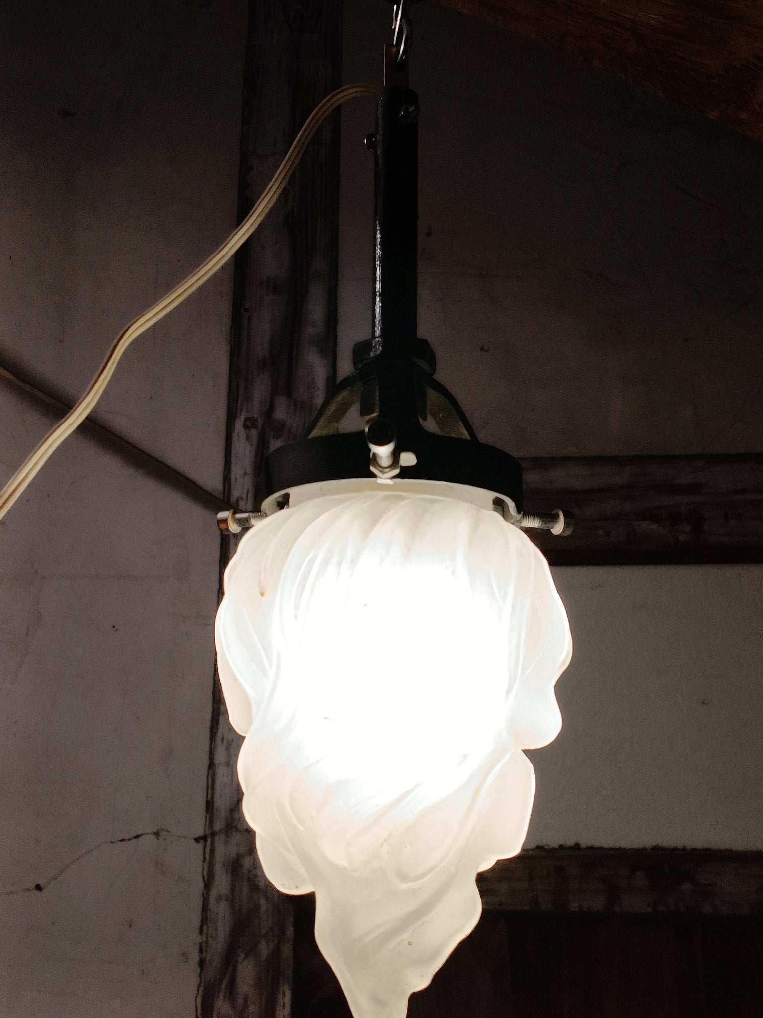 Lampe à suspension globe flambeau en verre dépoli, fonctionne.