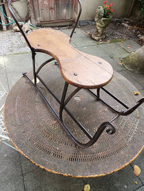 Traîneau Suisse allemand pour enfant en fer forgé et bois. Début XXÈME. Initial famille pyrogravé au dessous du siège.