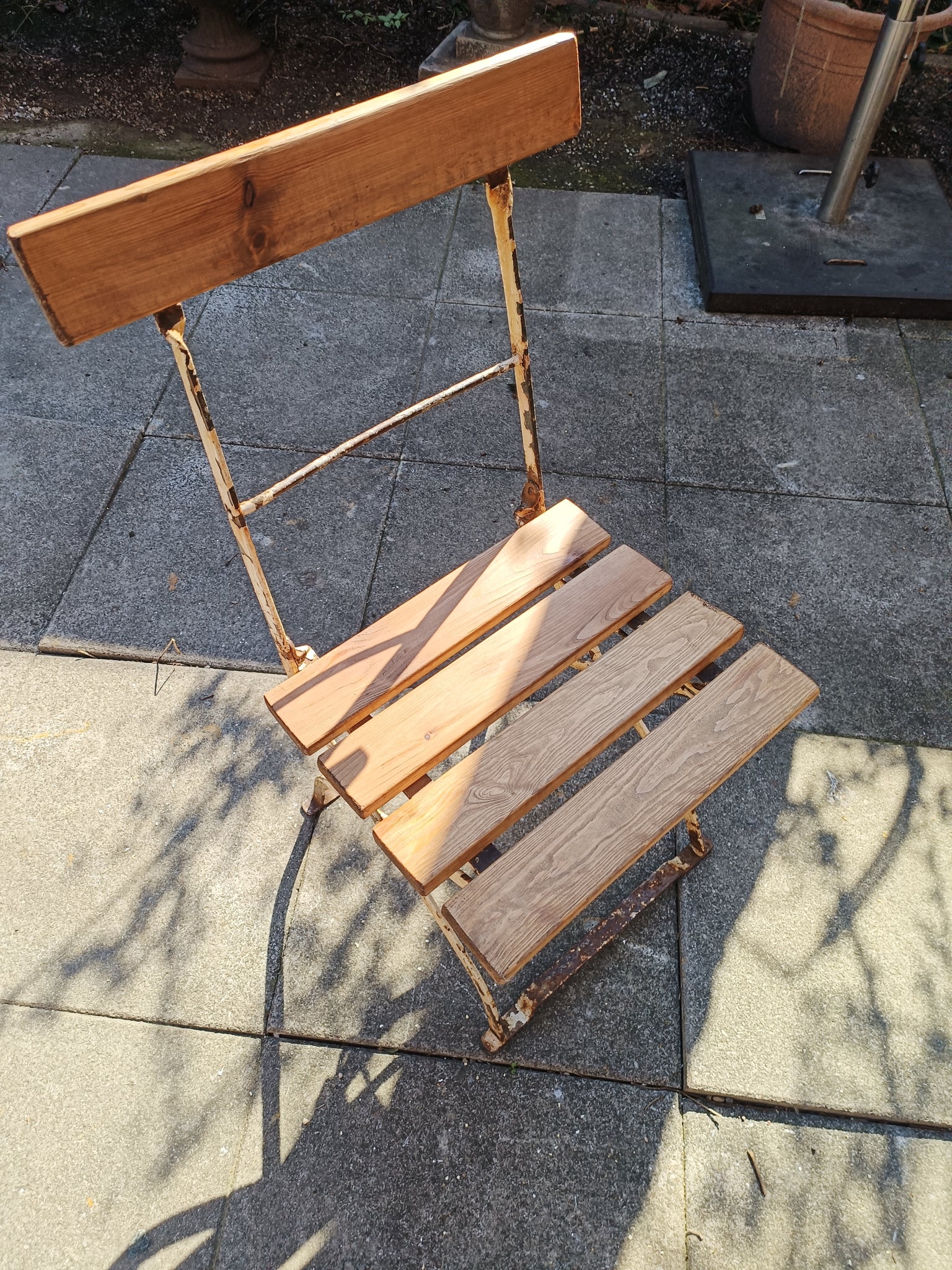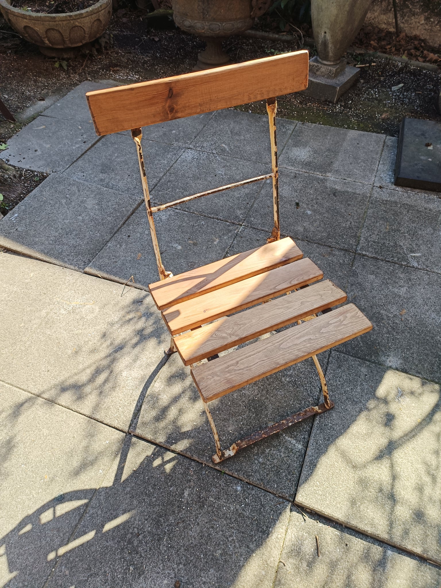 Chaise de jardin pliante ancienne, assise en sapin massif .