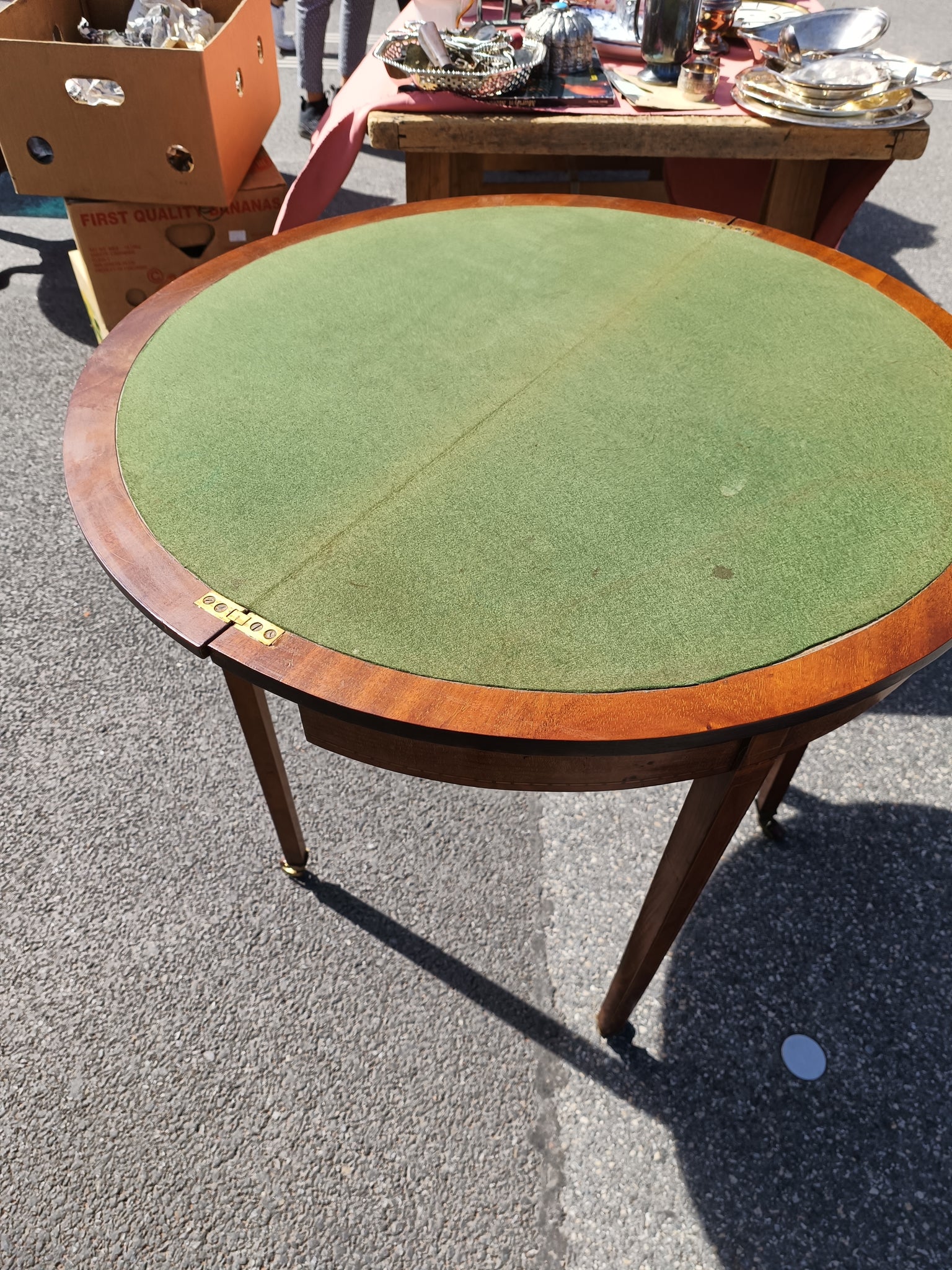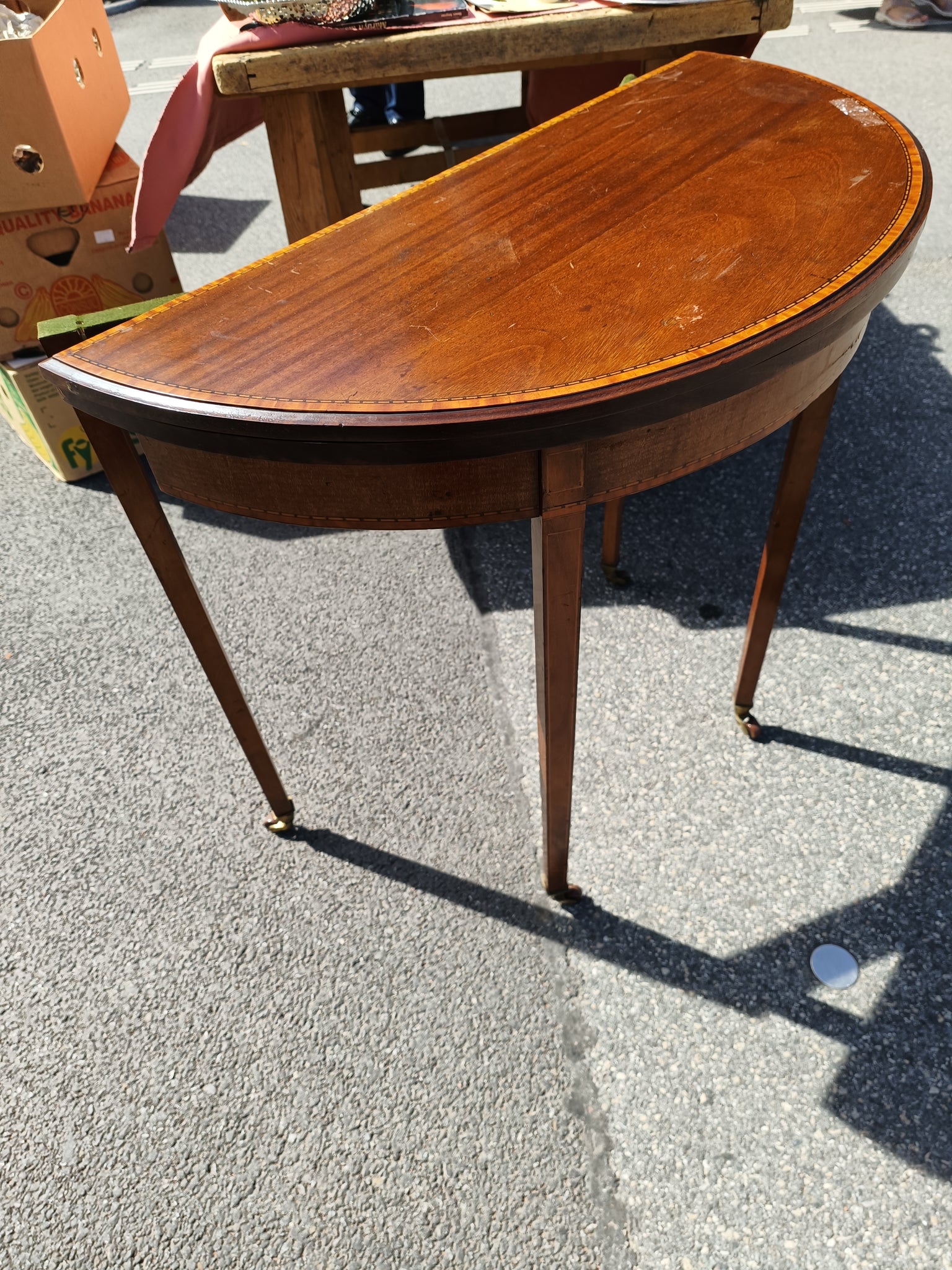 Petite console mi lune, table à jeux , début XXÈME Anglais , marqueterie acajou.