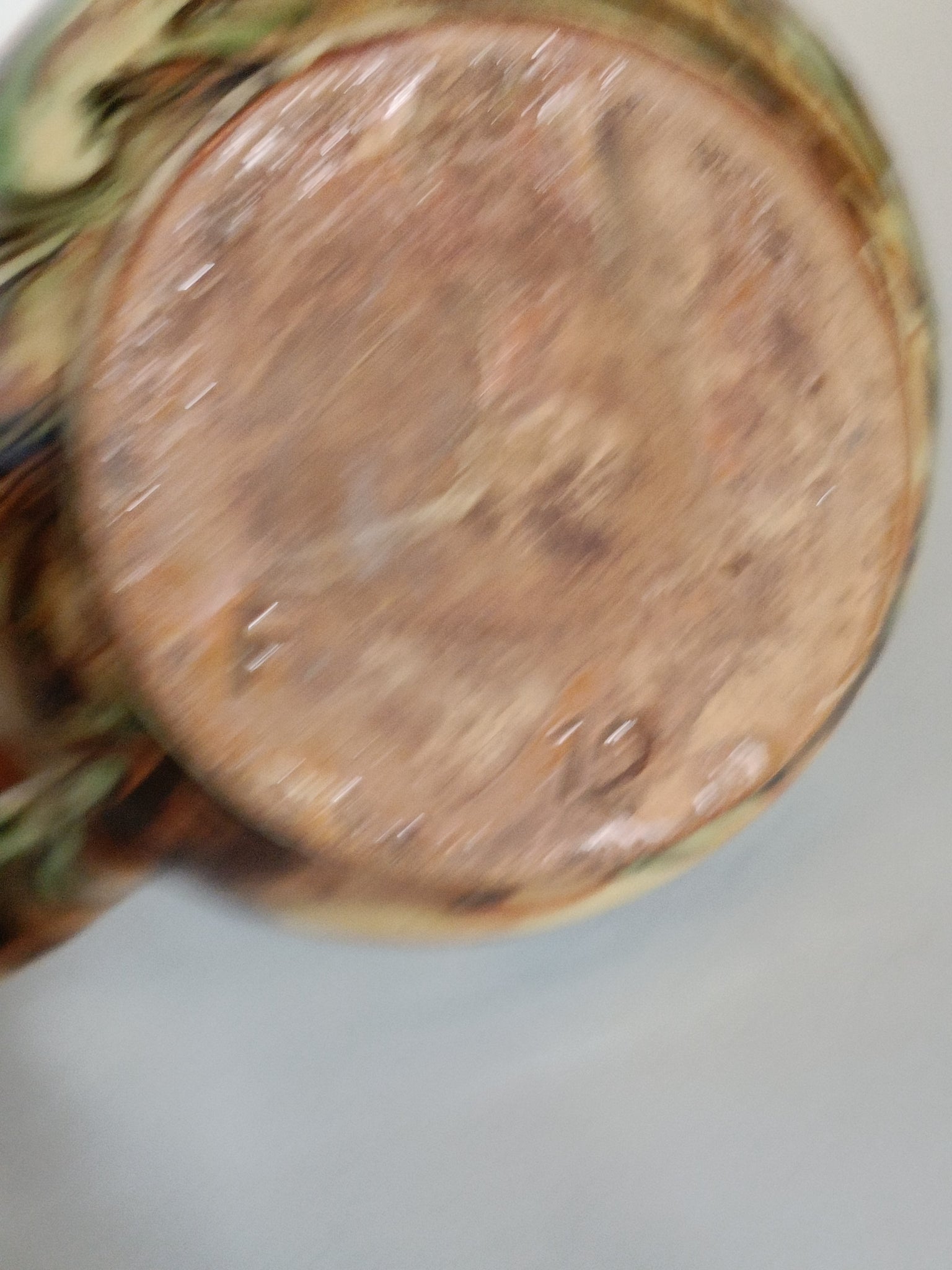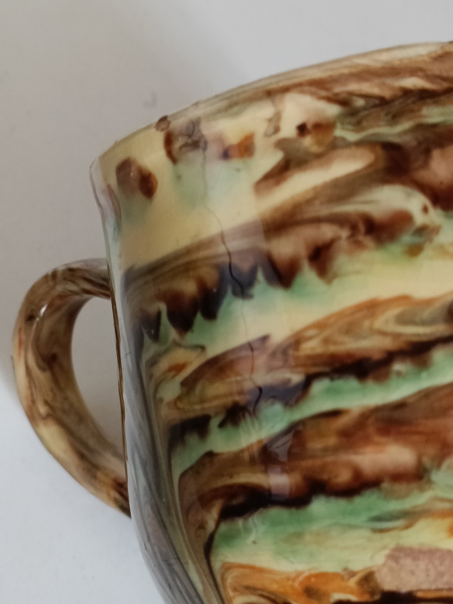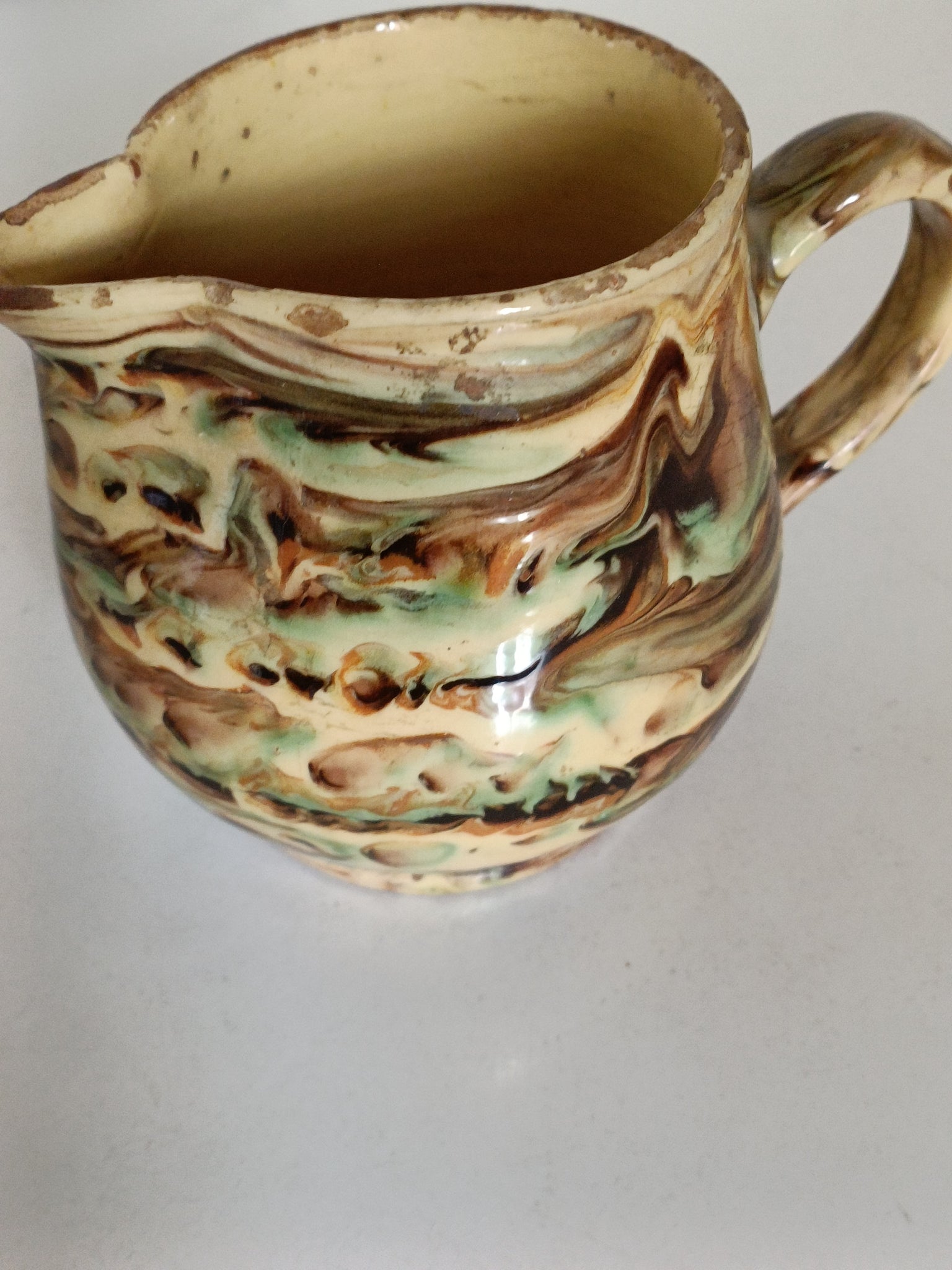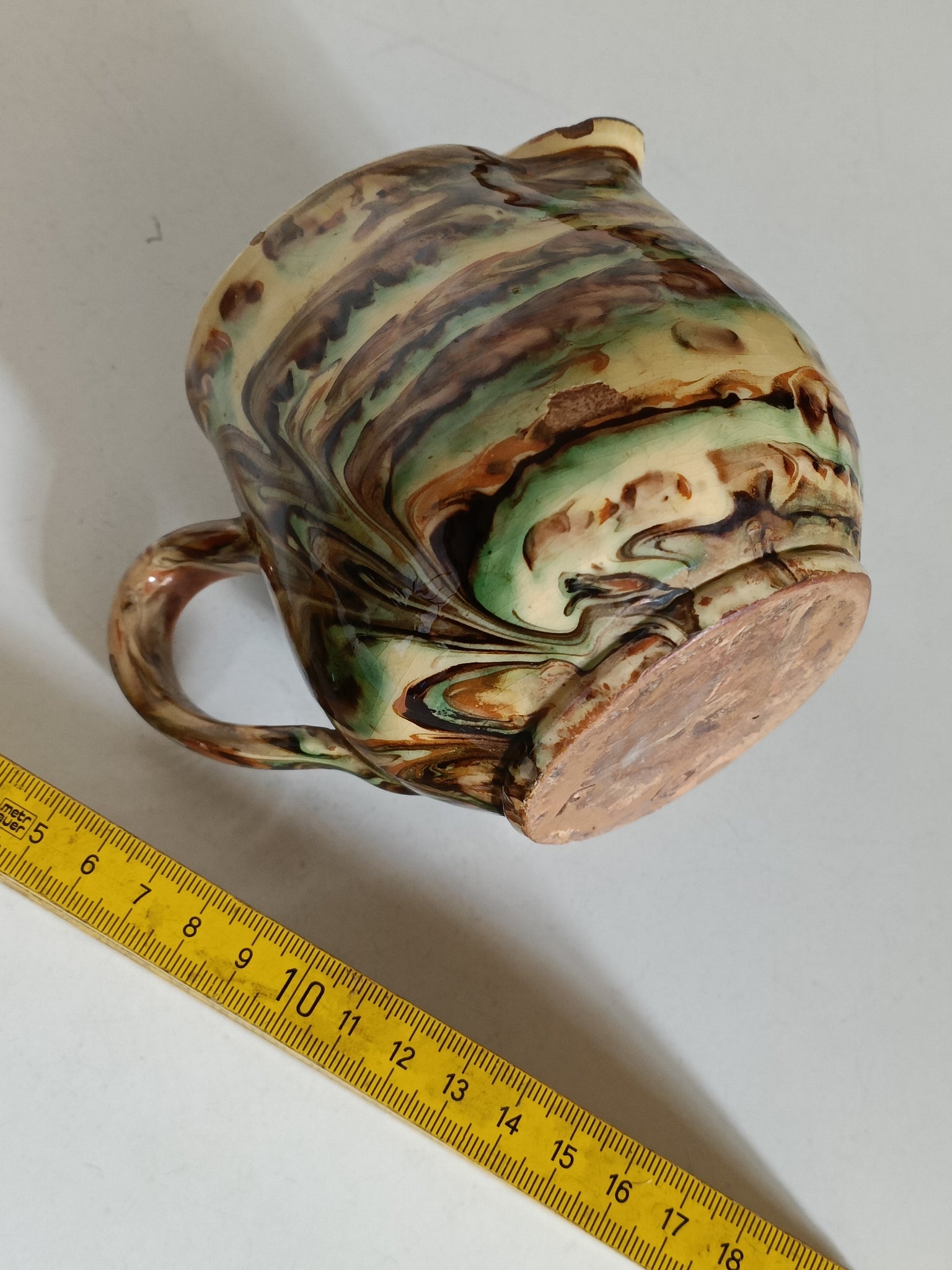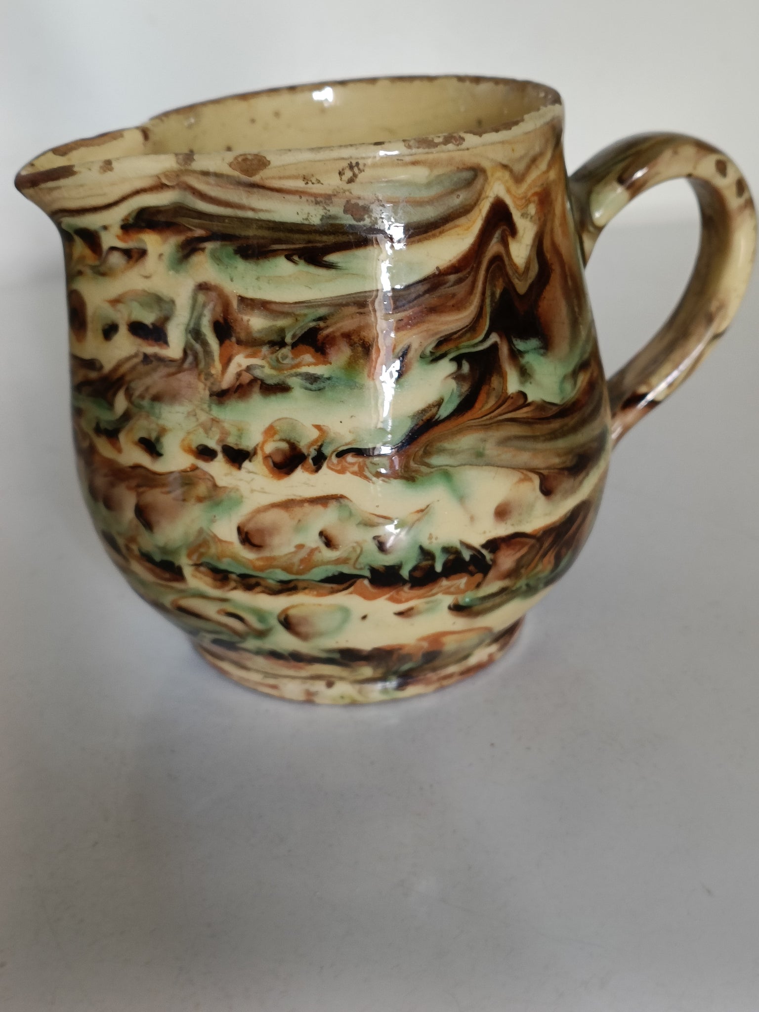 Pichet en céramique jaspé, probablement haute Savoie . Signé F ( Ferney?), et probablement nombre date  "12 " peut être aussi Suisse de Chavannes près Renens