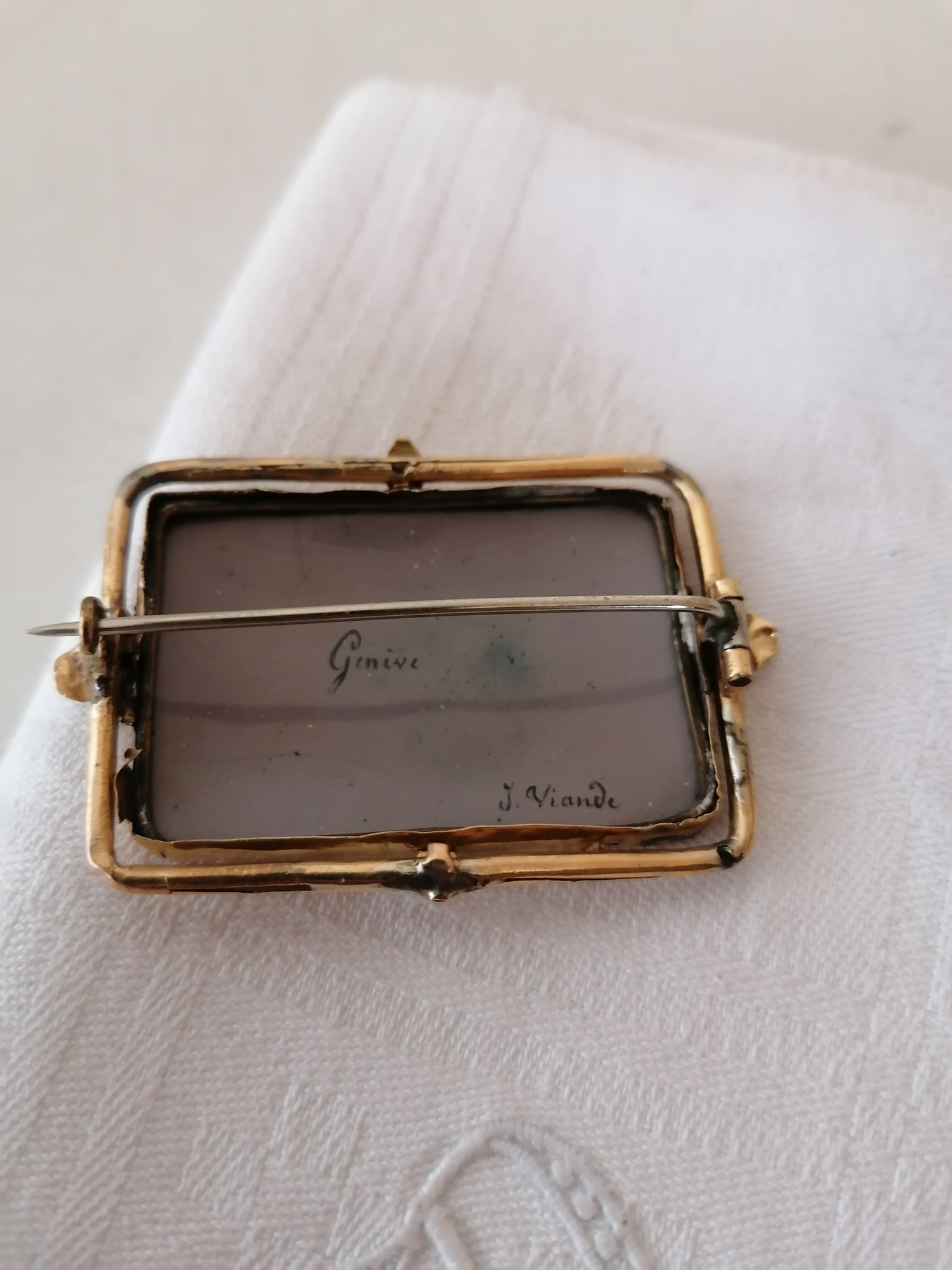 Broche en or avec vue de Genève peinte et émaillée miniature. Signé au dos. Vers 1850