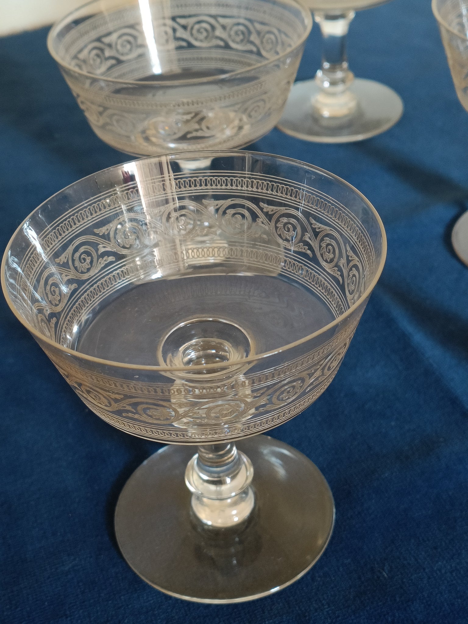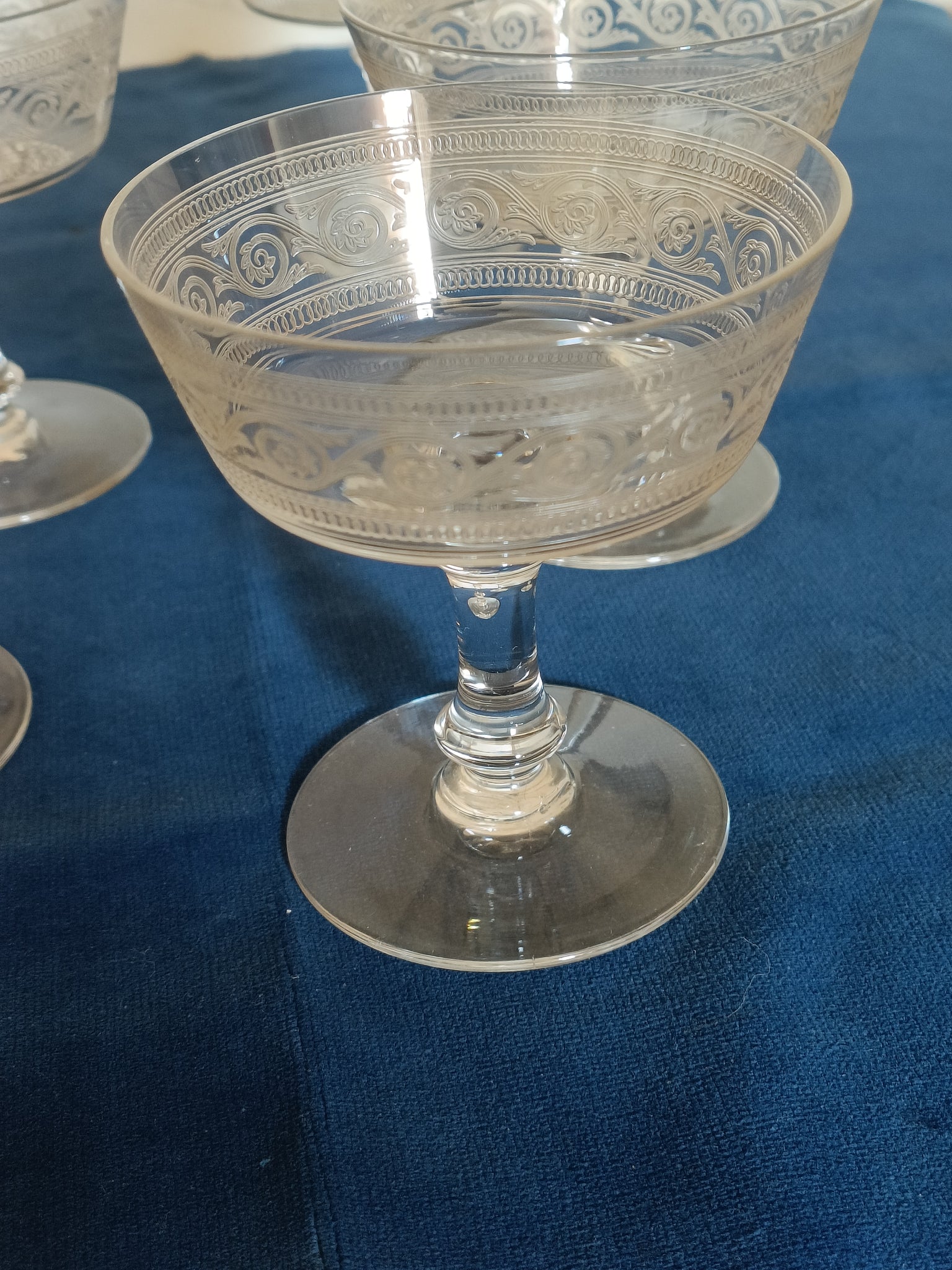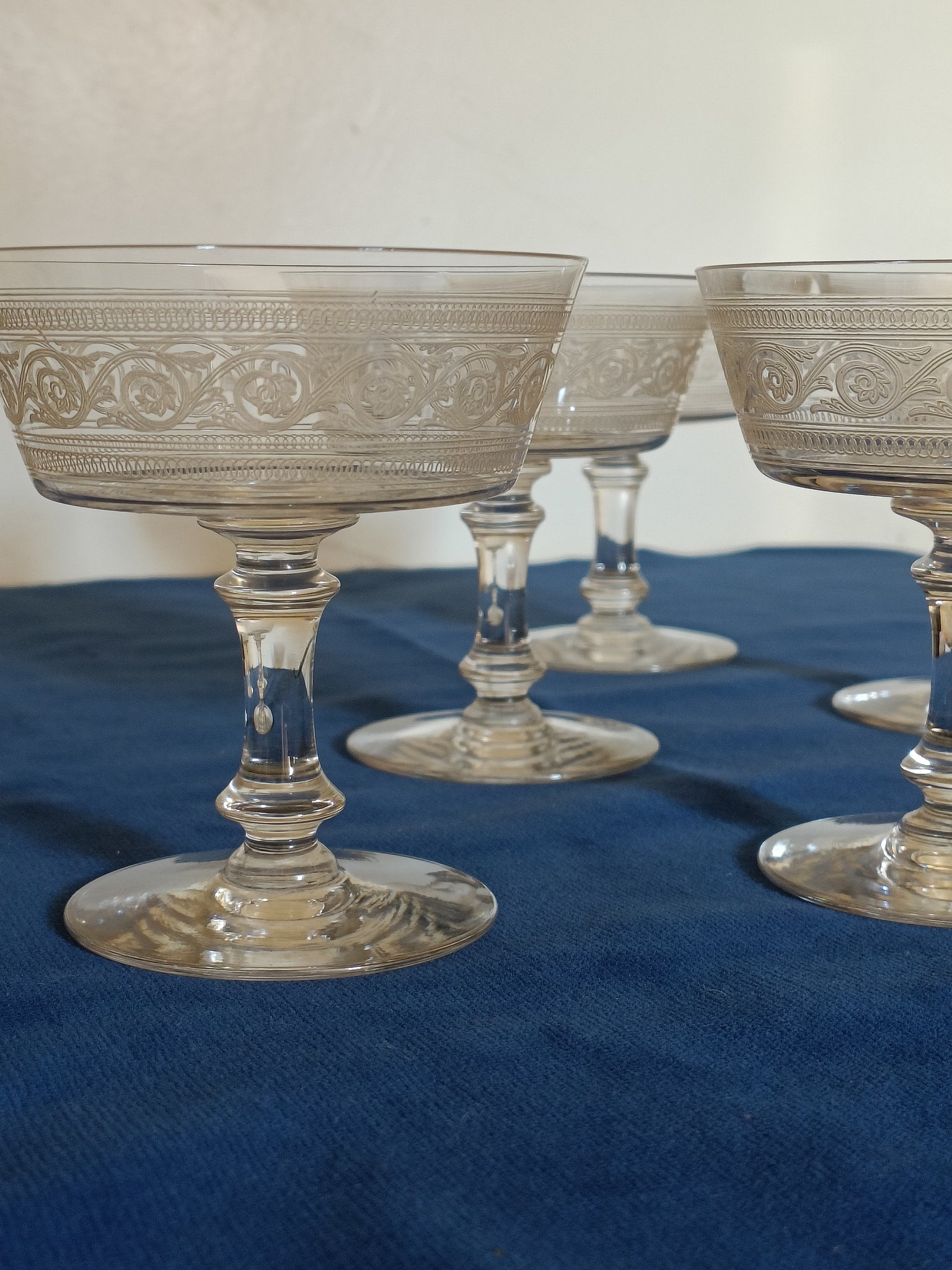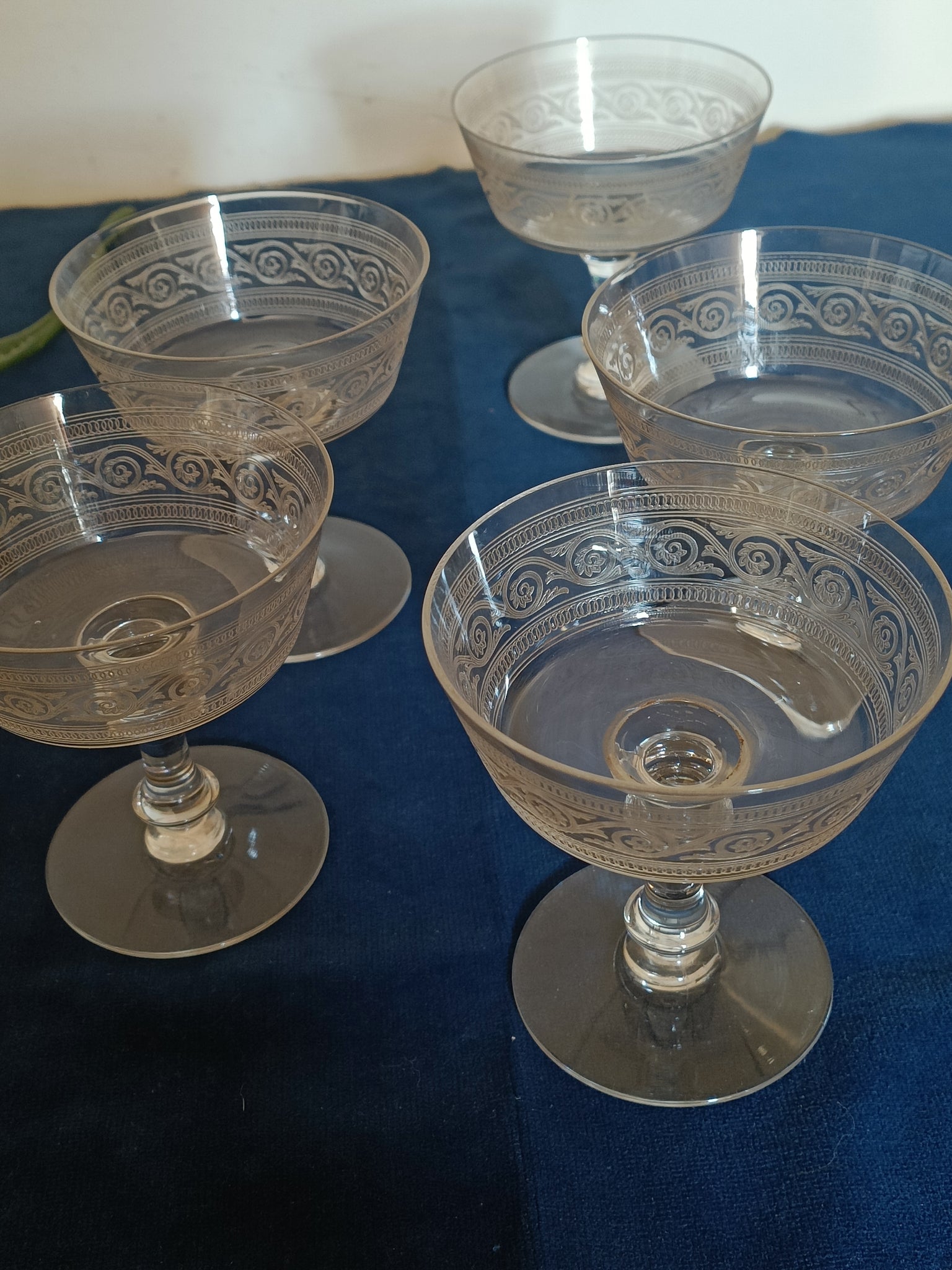 Série de 5 coupes à Champagne ancienne en cristal gravé à l'acide. Parfait état