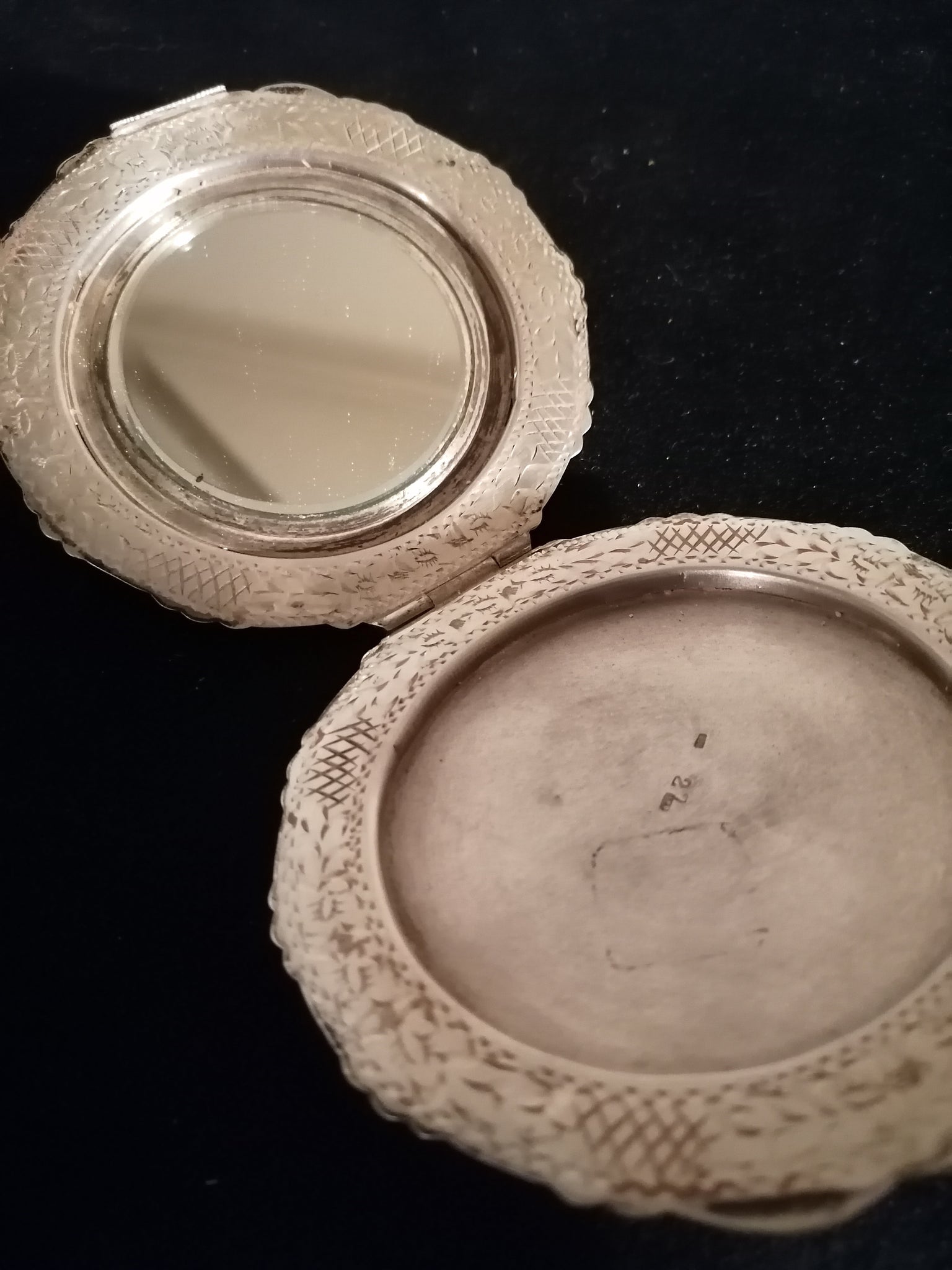 Boîte à poudrer et miroir en argent 0.800 ciselé.