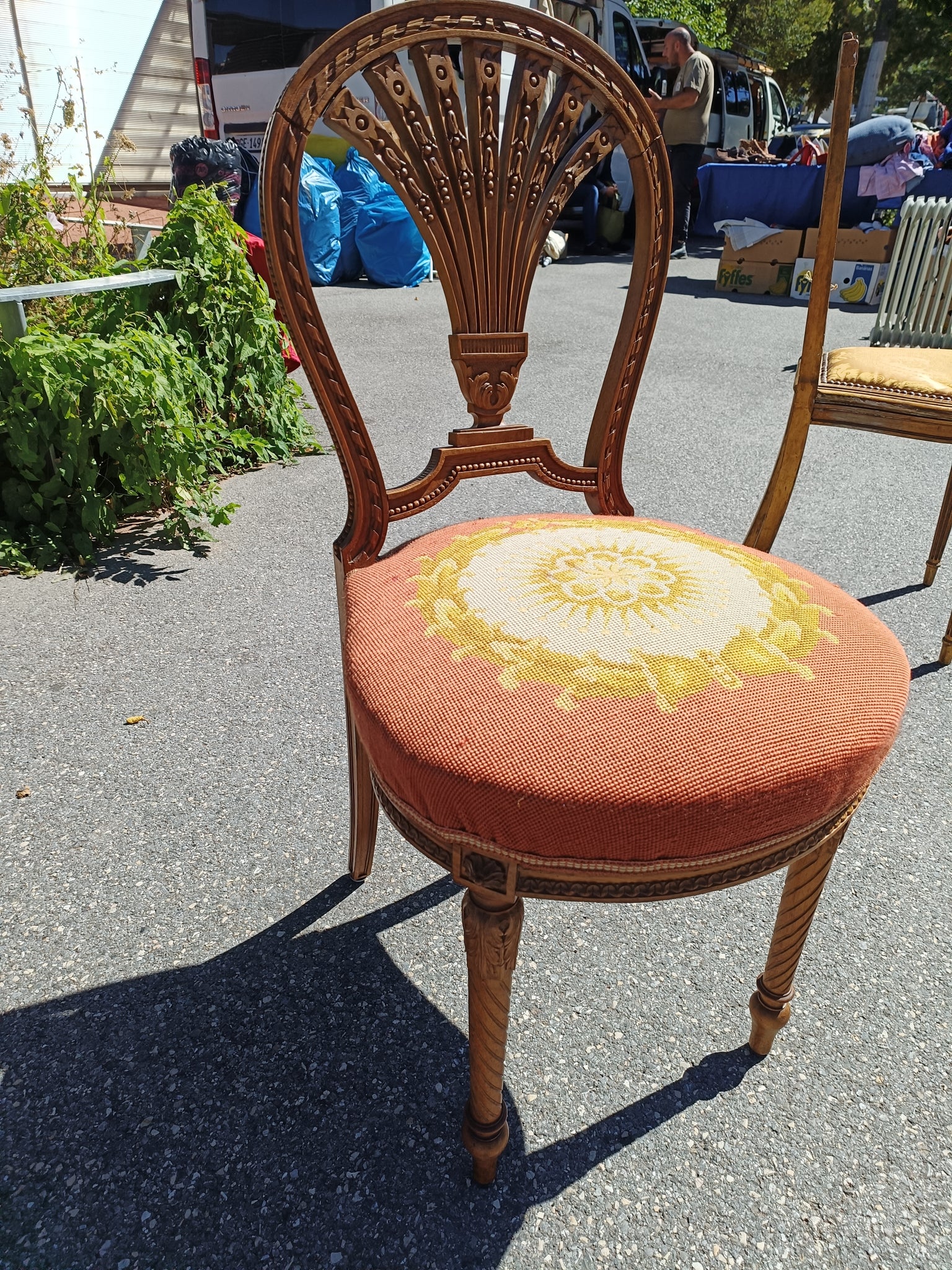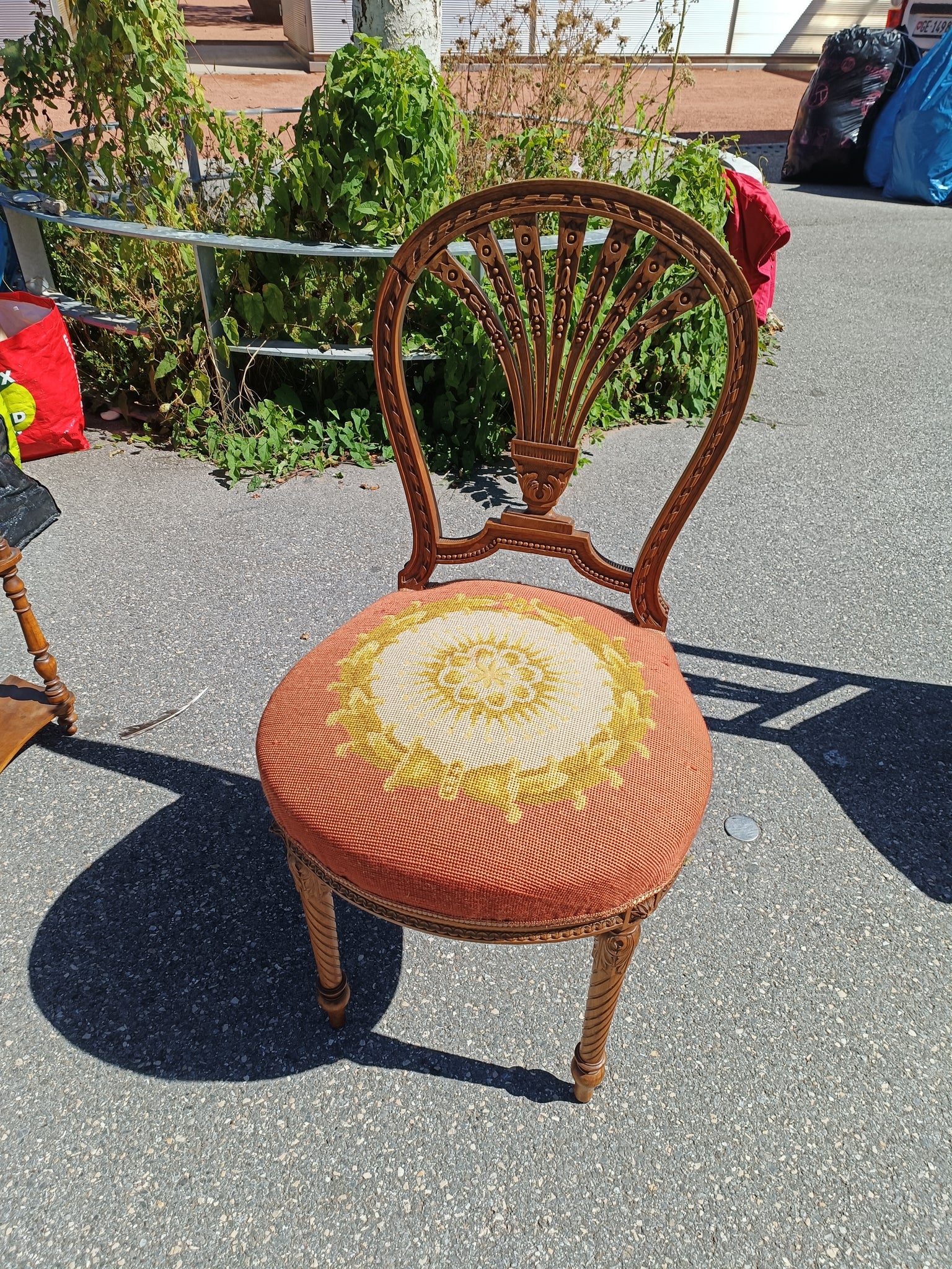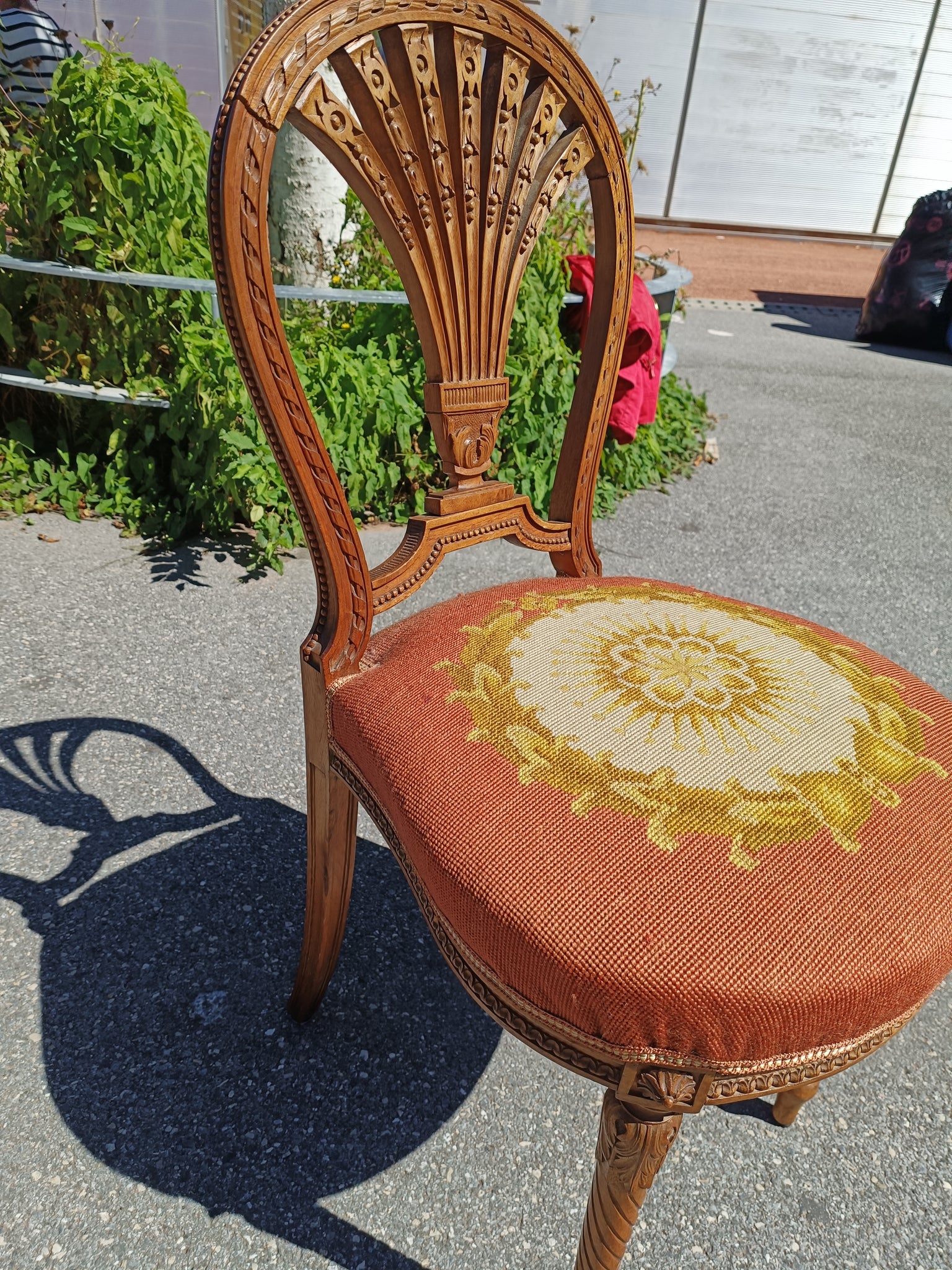 Chaise mongolfière style Louis XVI en noyer finement sculptée, tissus broderie. Parfait état