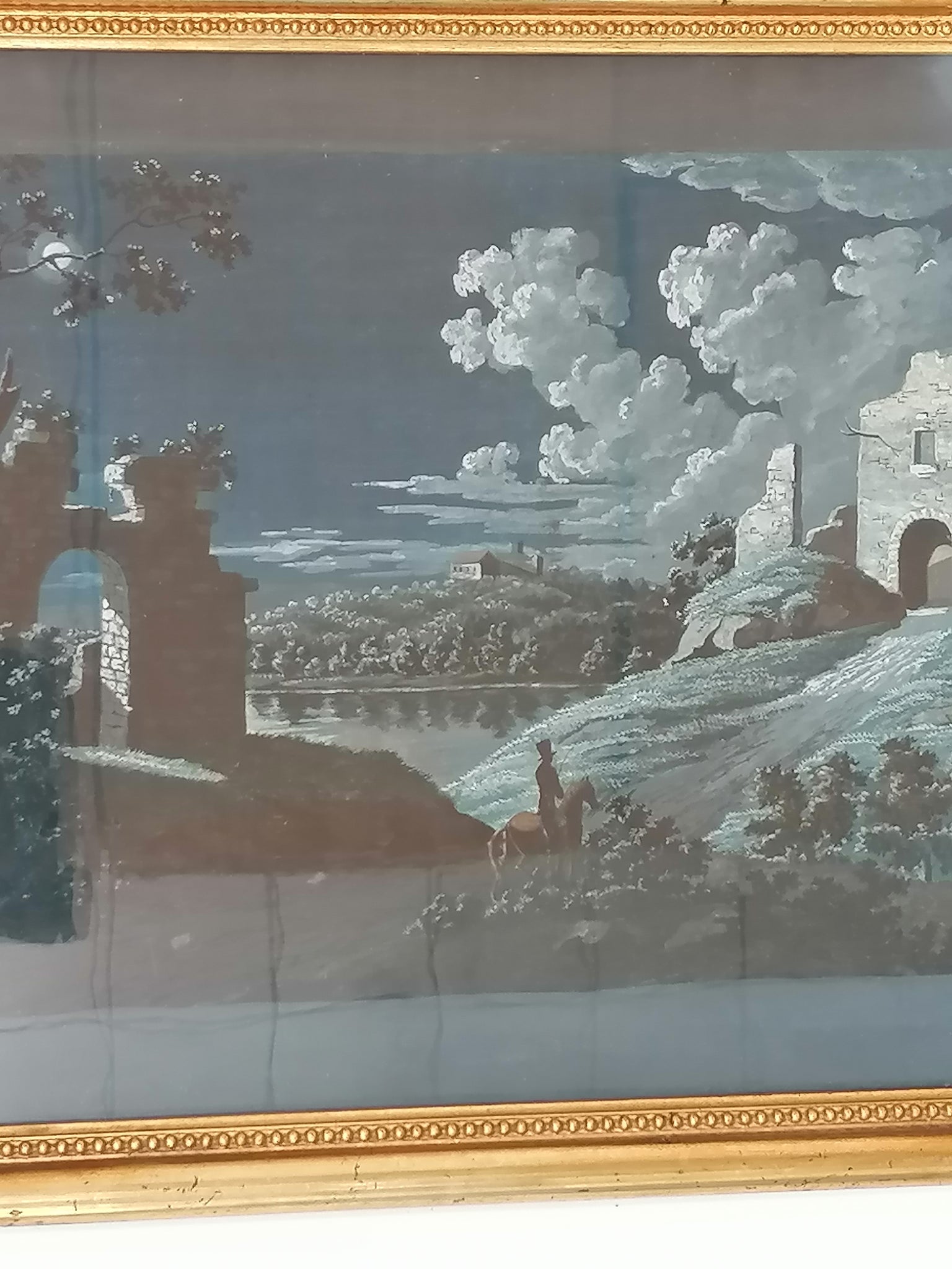 Gouache Napolitaine 19ème, paysage romantique au clair de lune dans le centre de l'Italie . Environ 1830
