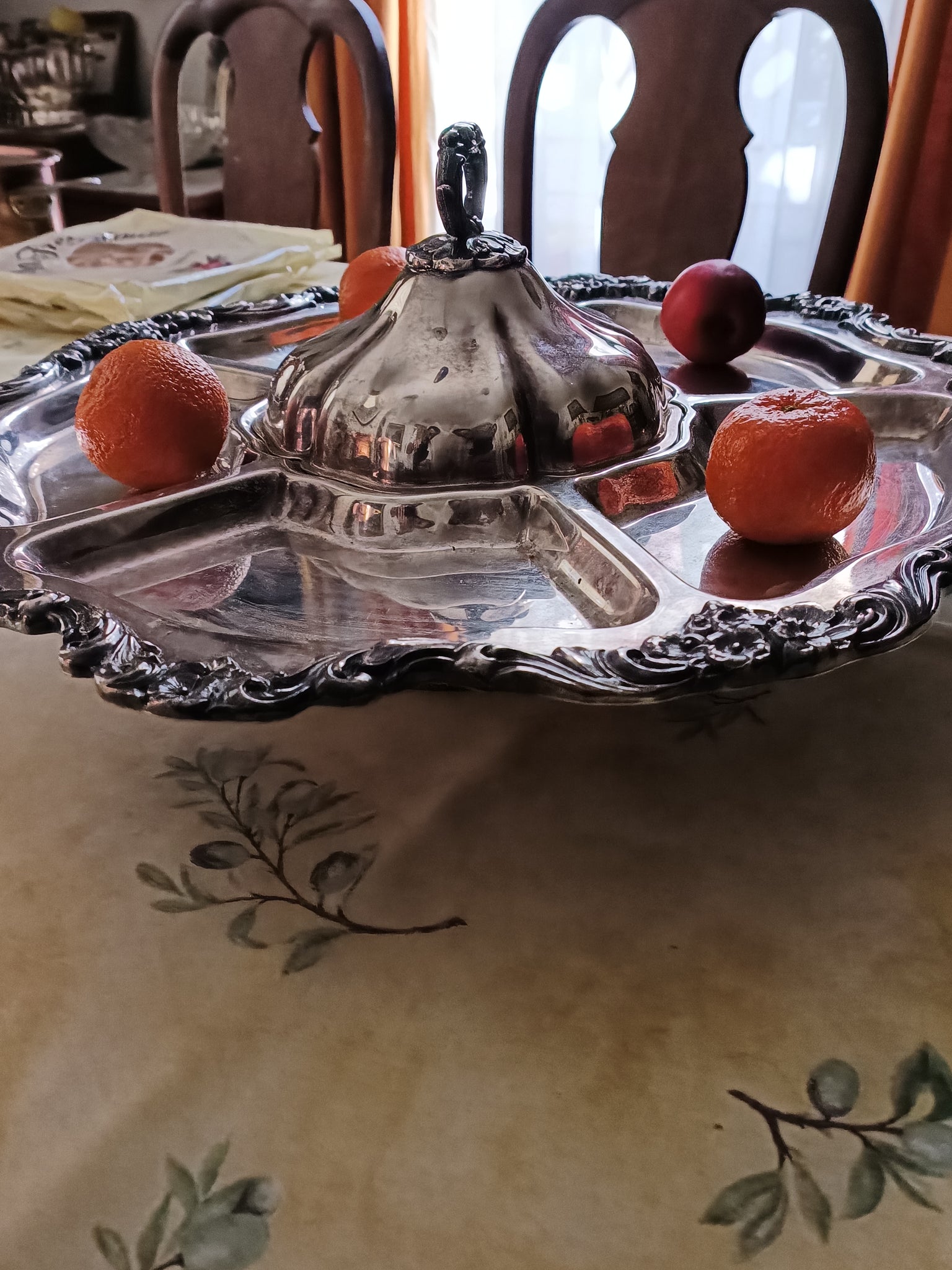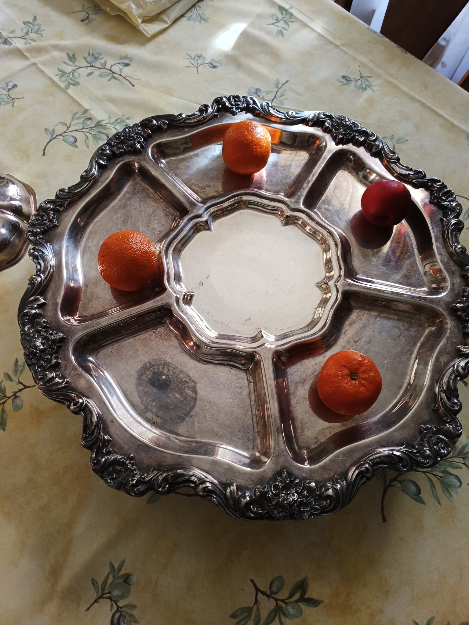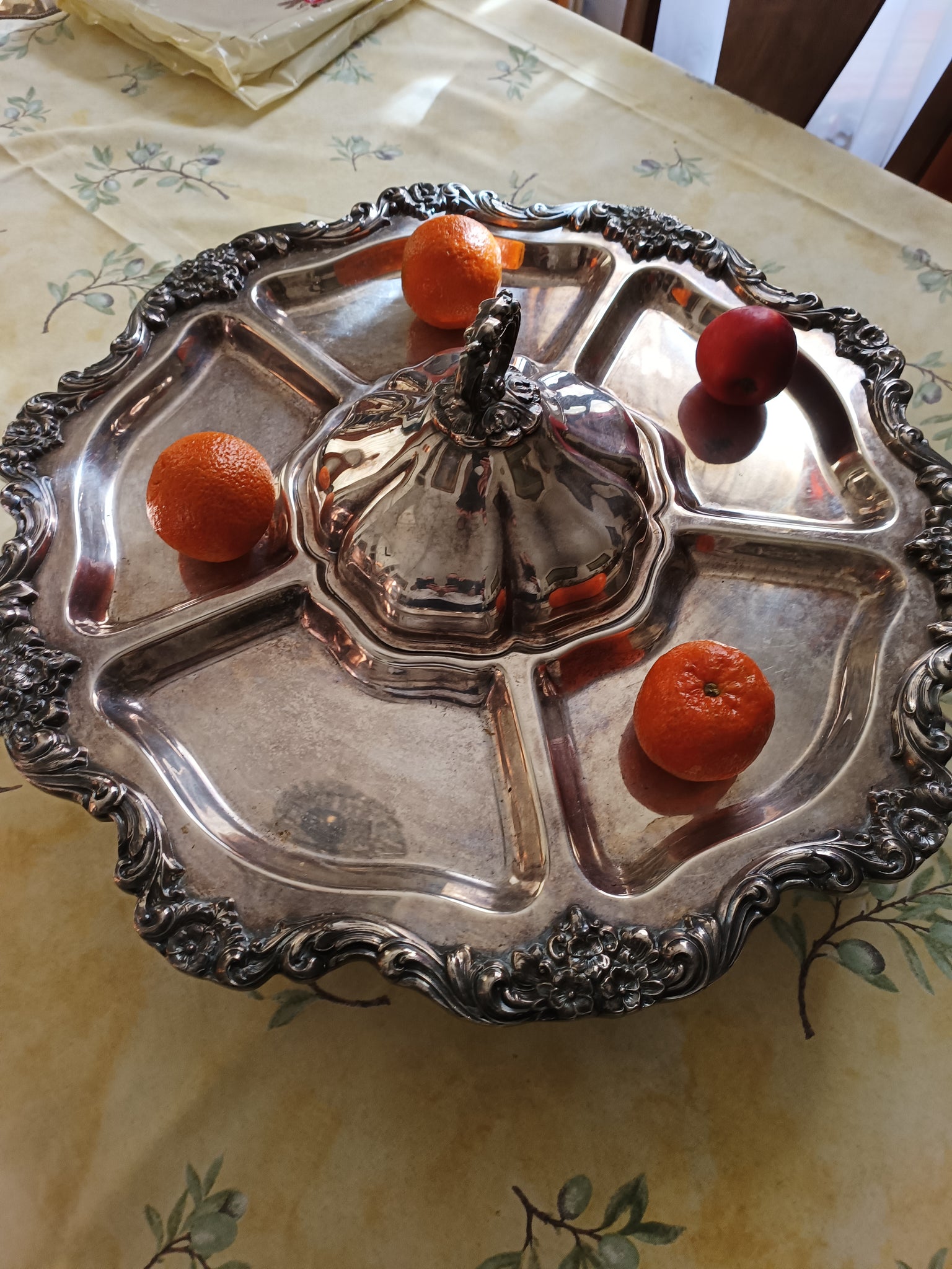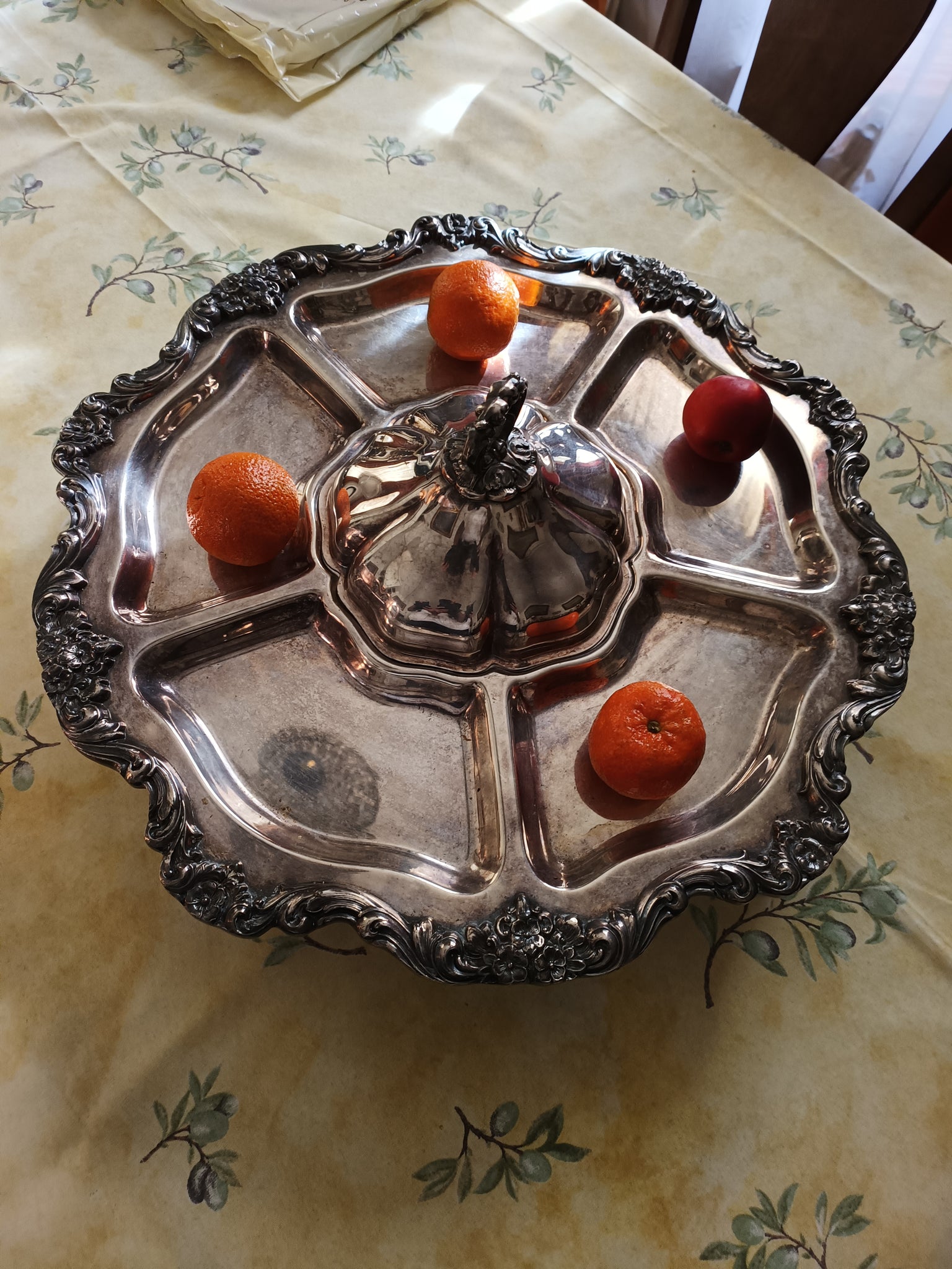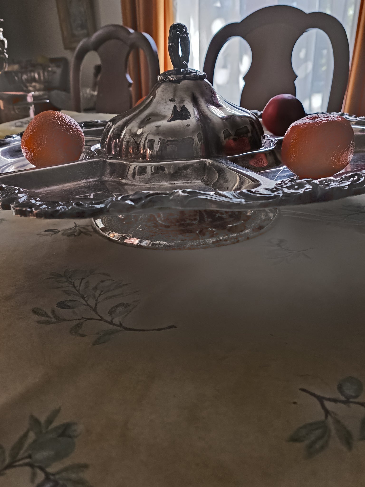 Grand centre de tables pivotant à servir Anglais, en métal argenté. 2 partie