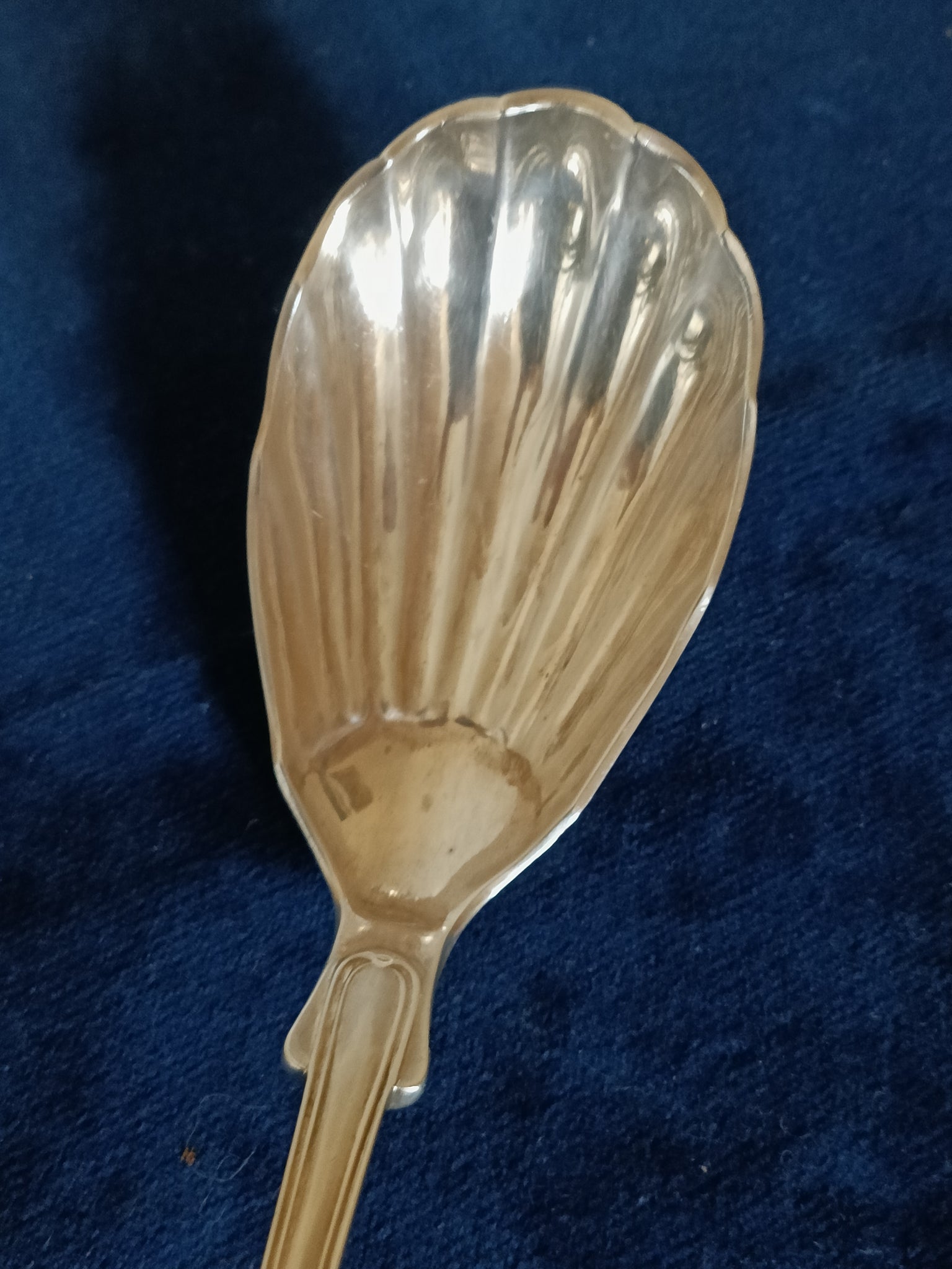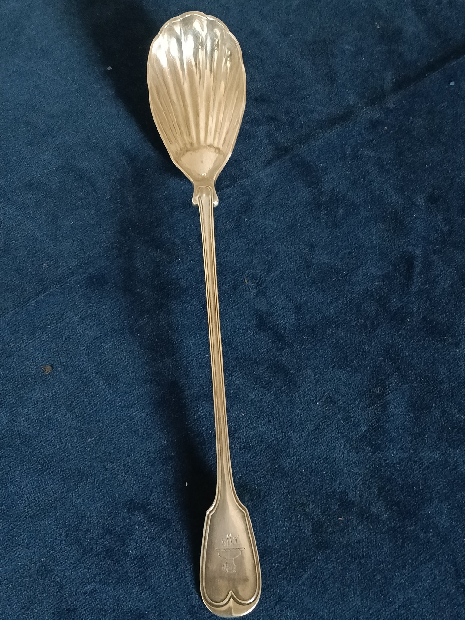 Grande cuillère à service américaine dite à farce. En argent massif Sterling Américain XIXÈME orfèvre à identifier. Armoirie de famille originale à identifier également. 137g