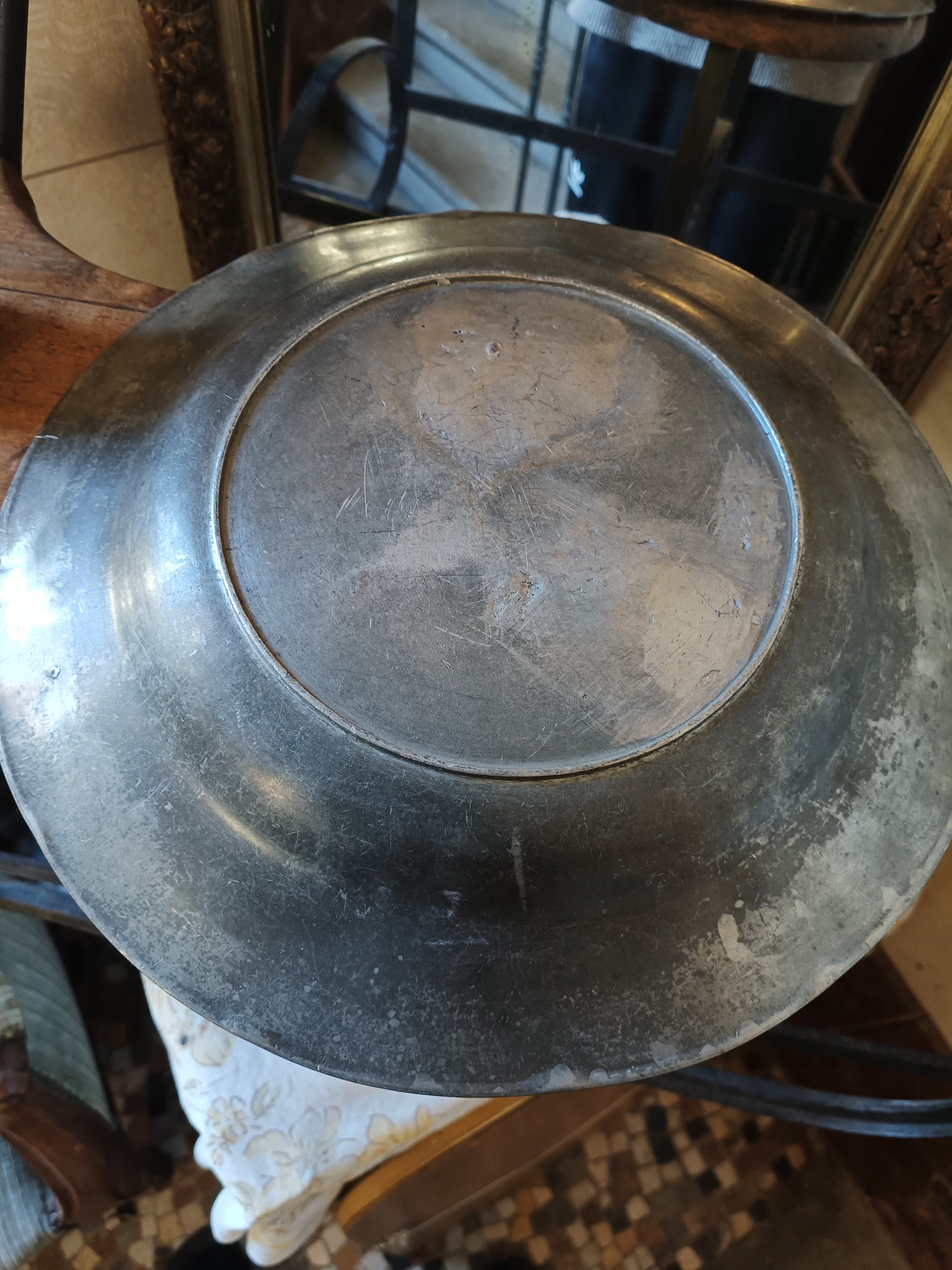Kaiserzin grande assiette en étain d'époque Art nouveau. Avec réparation diamètre 35 cm